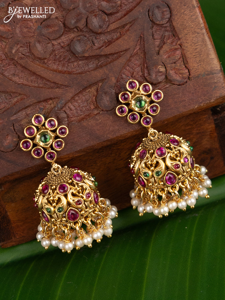 Antique jhumka peacock design with kemp stones and pearl hangings