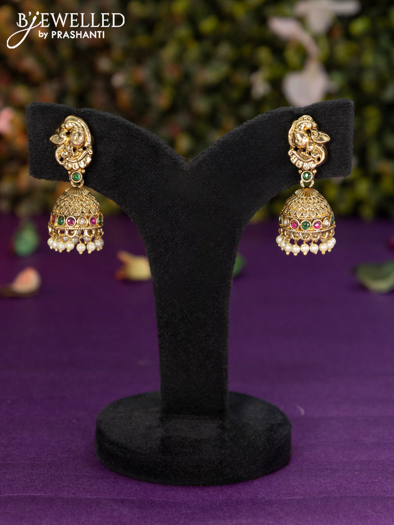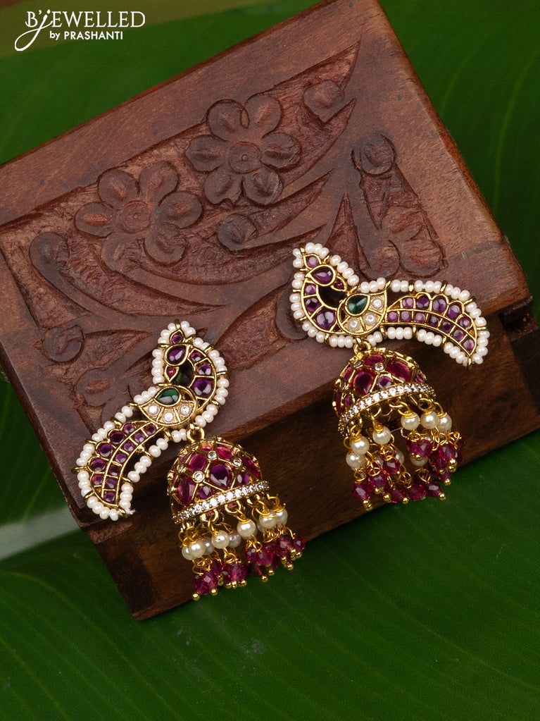 Antique jhumka peacock design with kemp & cz stones pearl hangings