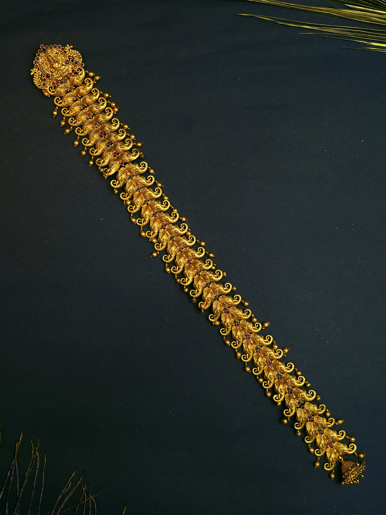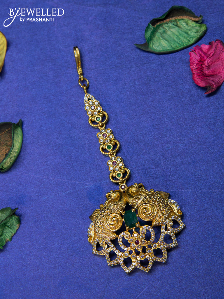 Antique maang tikka peacock design with kemp & cz stones and pearl hangings