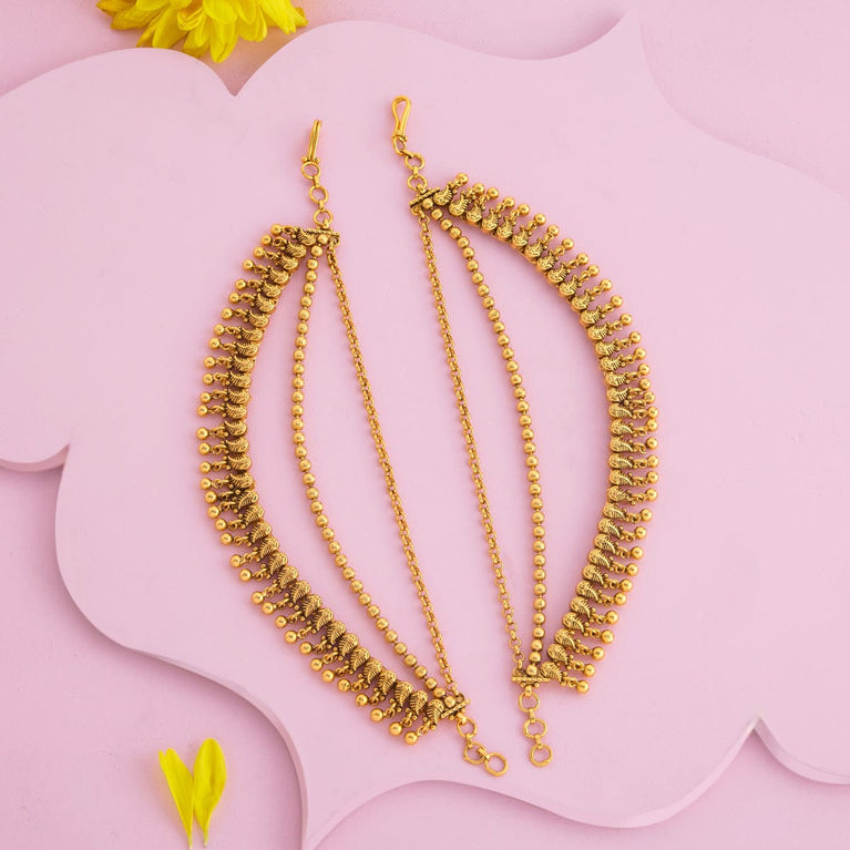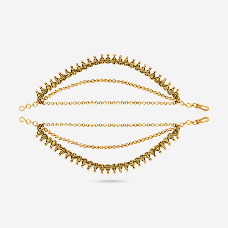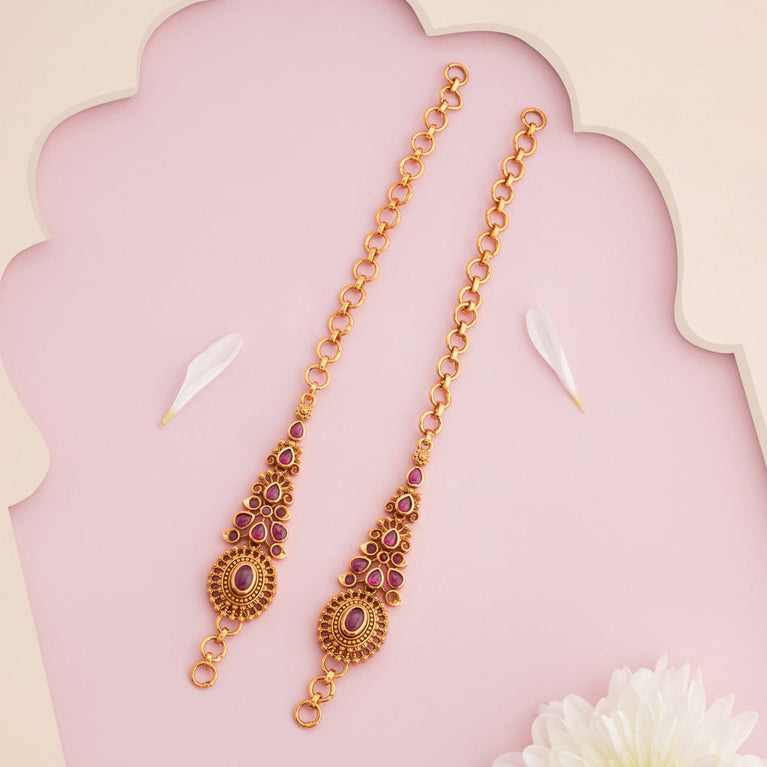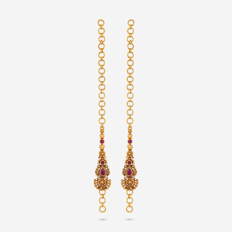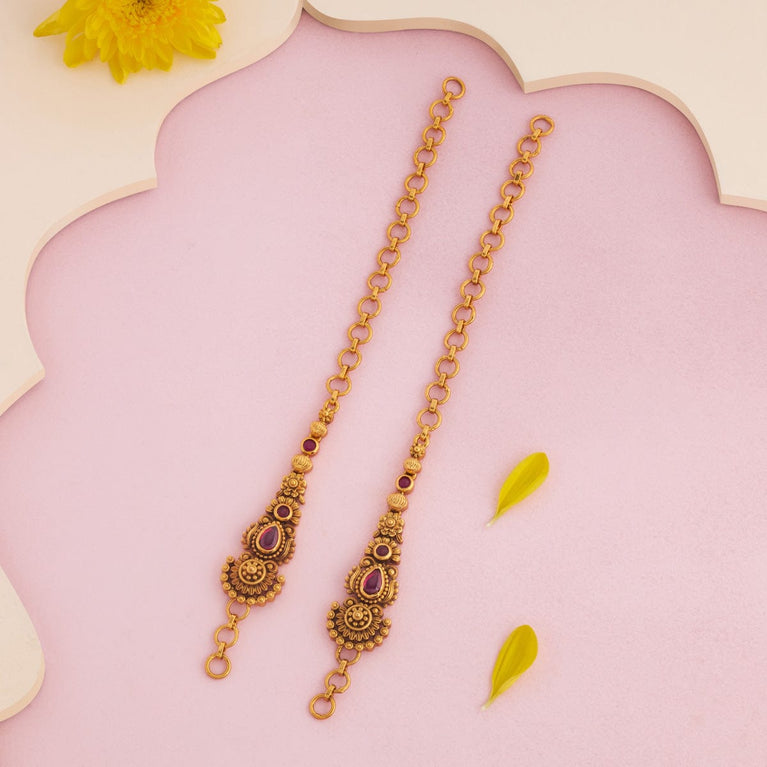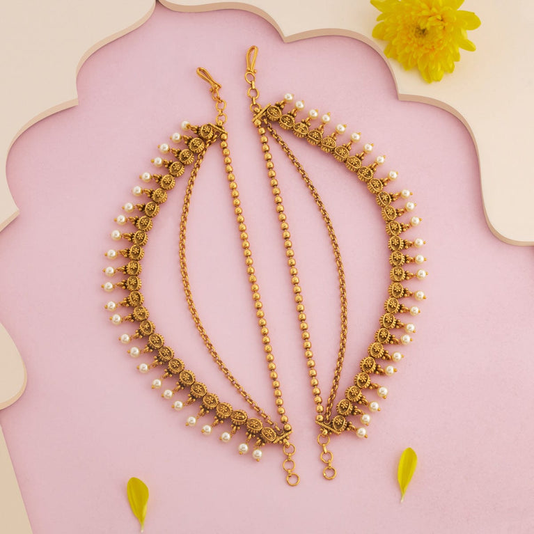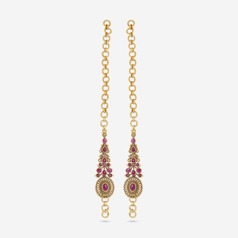 Antique medium size maatal type jhumka with kemp & cz stones and pearl hangings