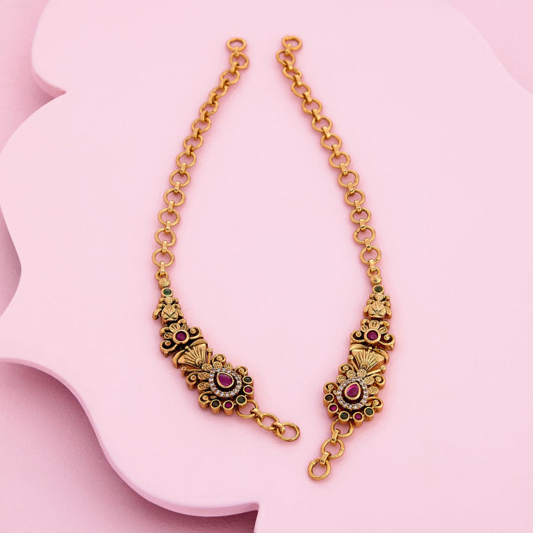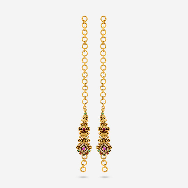 Antique medium size peacock design jhumka with kemp and pearl hangings