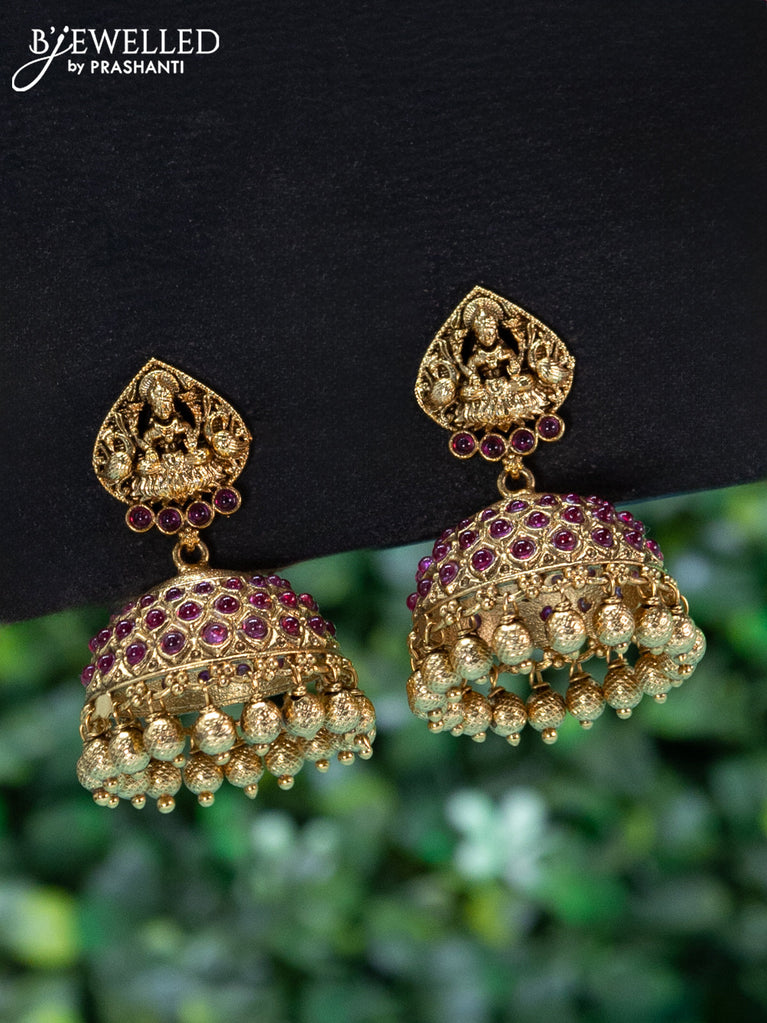 Antique necklace lakshmi design with pink jadau stones and golden beads hanging