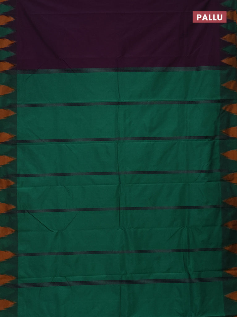 Arani semi silk saree deep purple and green mustard yellow with plain body and temple design border