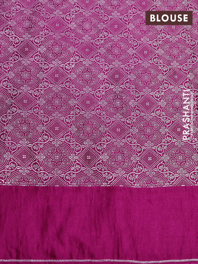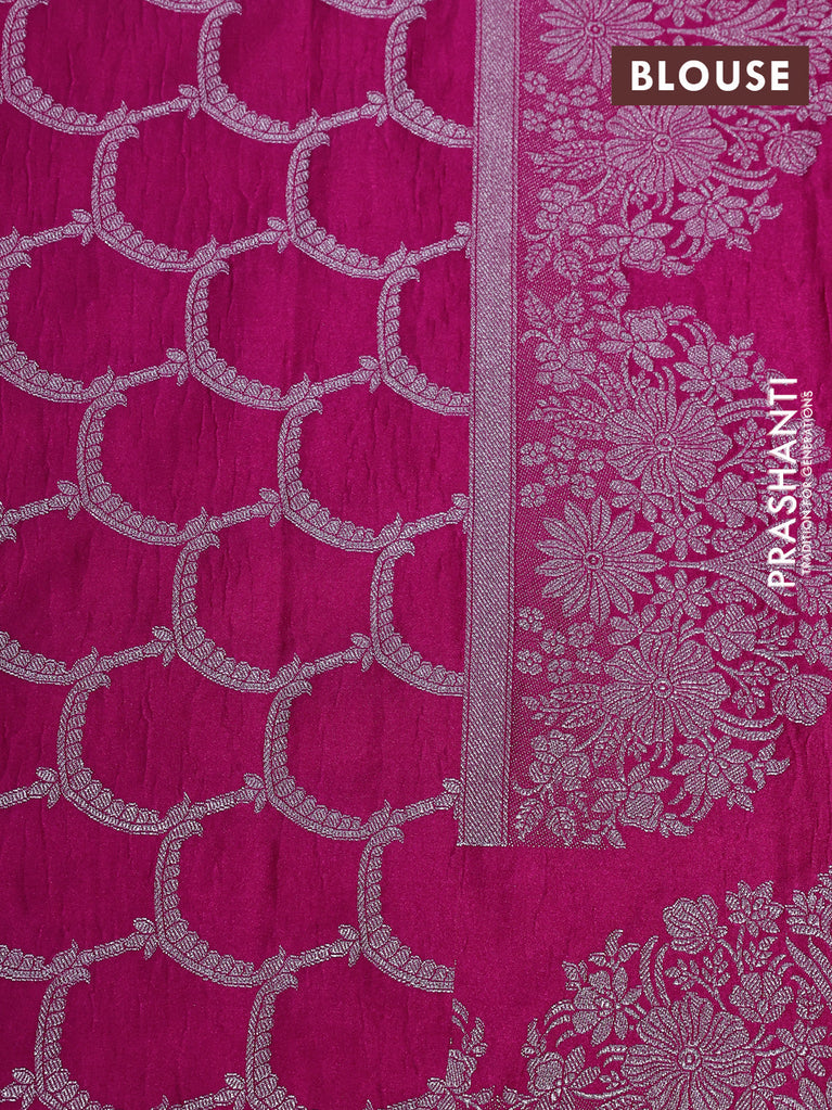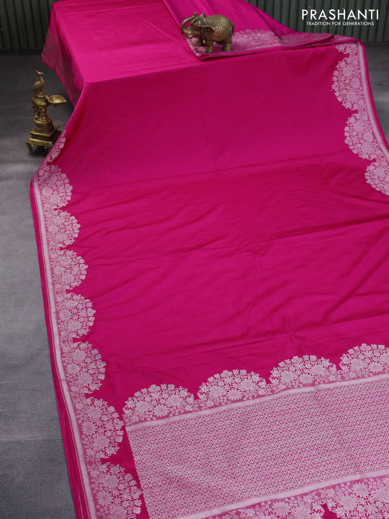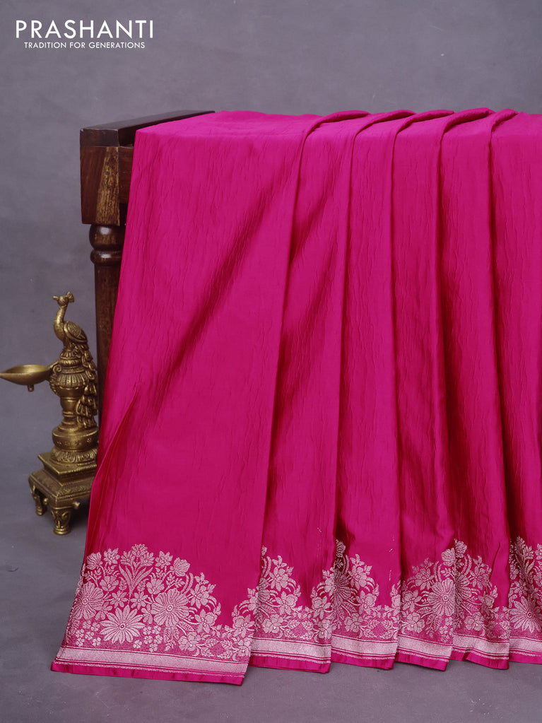 Banarasi crush crepe saree pink with plain body and silver zari woven floral border
