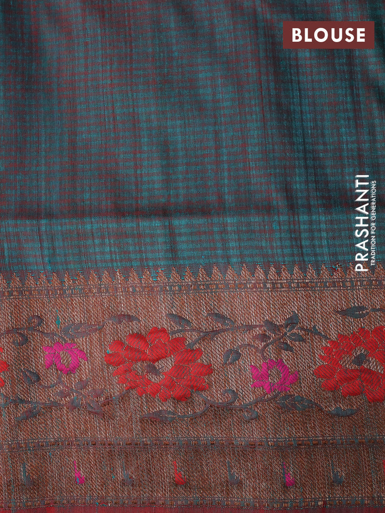 Banarasi dupion silk saree teal green and red with zari woven buttas and floral design paithani style border