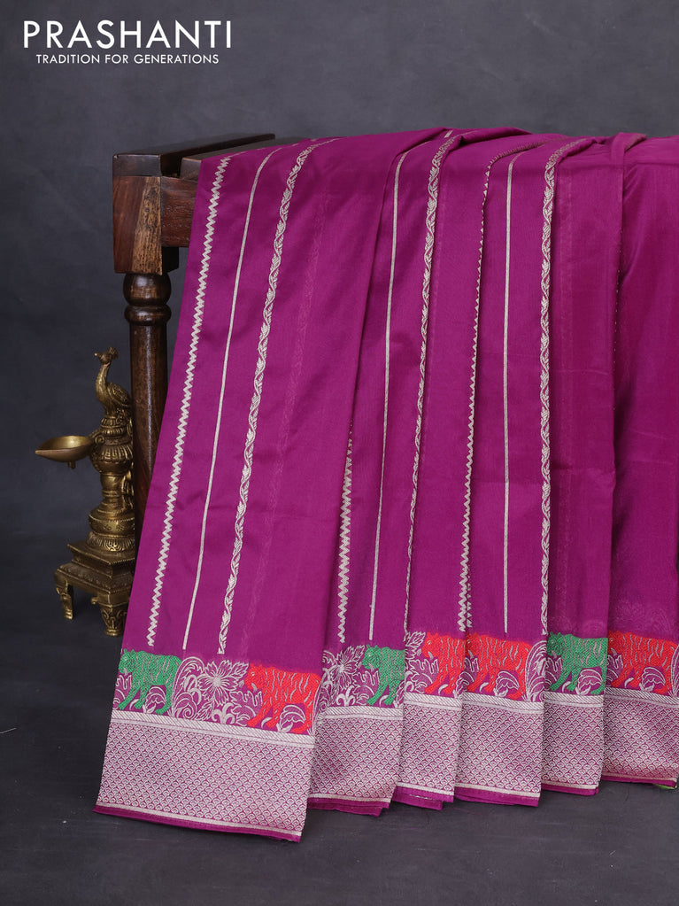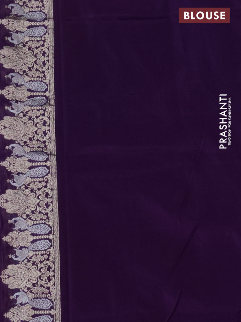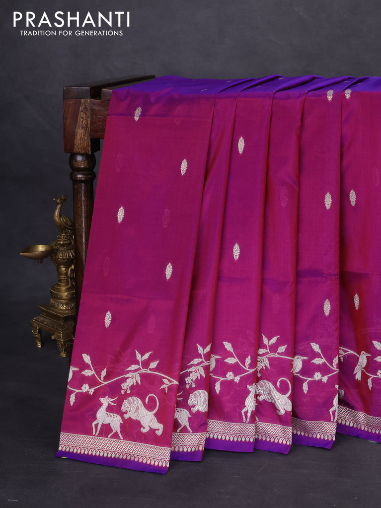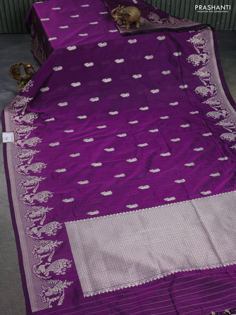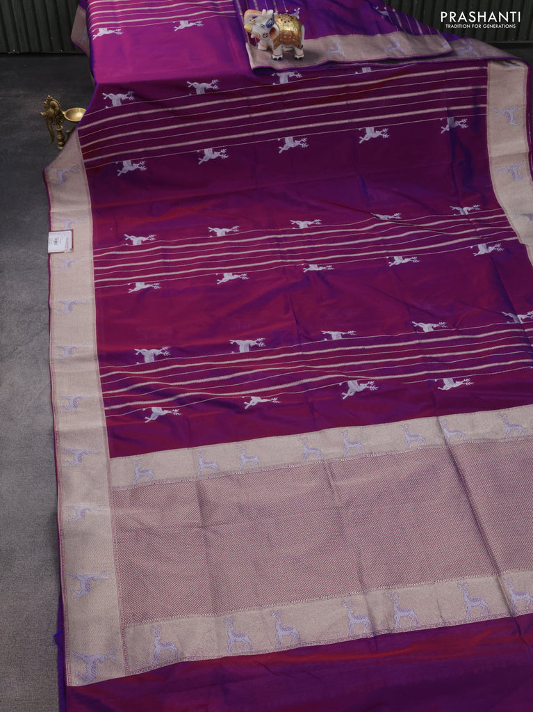 Banarasi semi katan silk saree purple with allover silver & gold zari weaves and deer design zari woven border