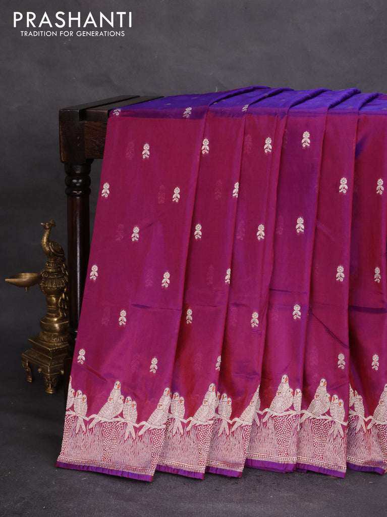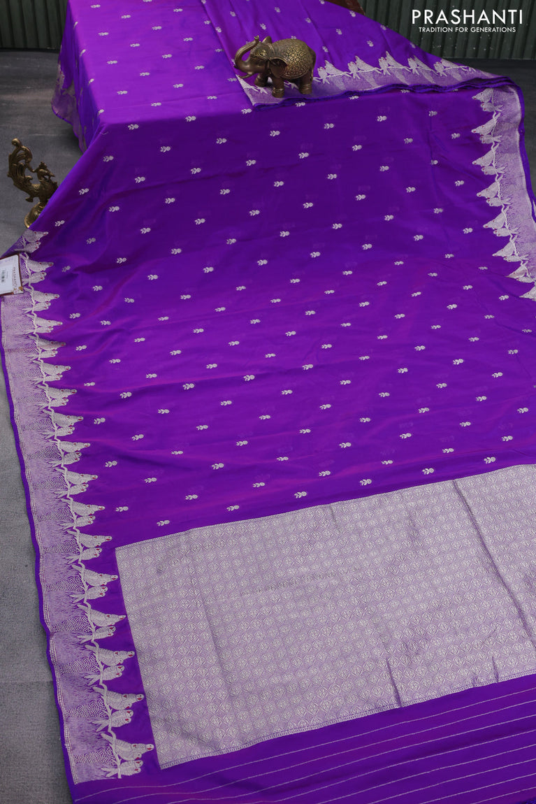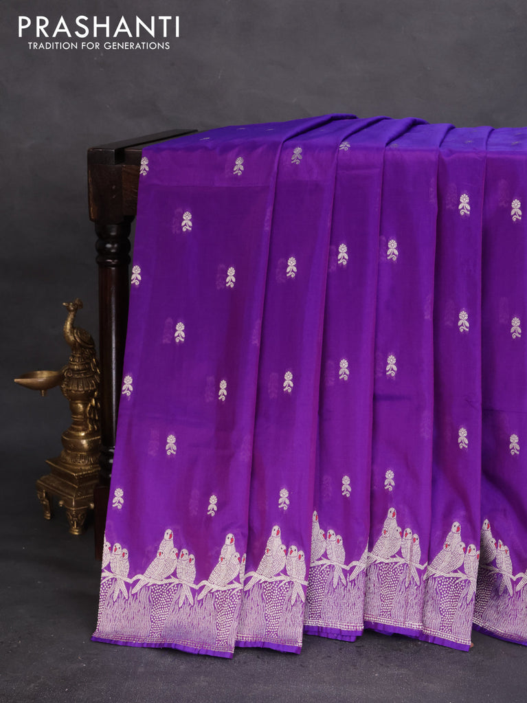 Banarasi semi katan silk saree purple with allover zari woven buttas and parrot design zari woven border