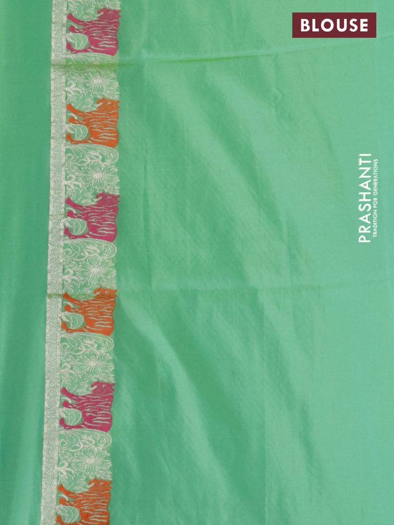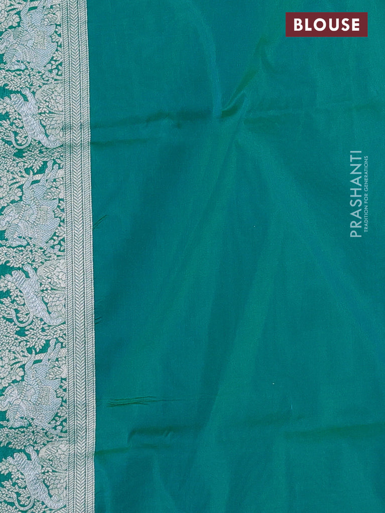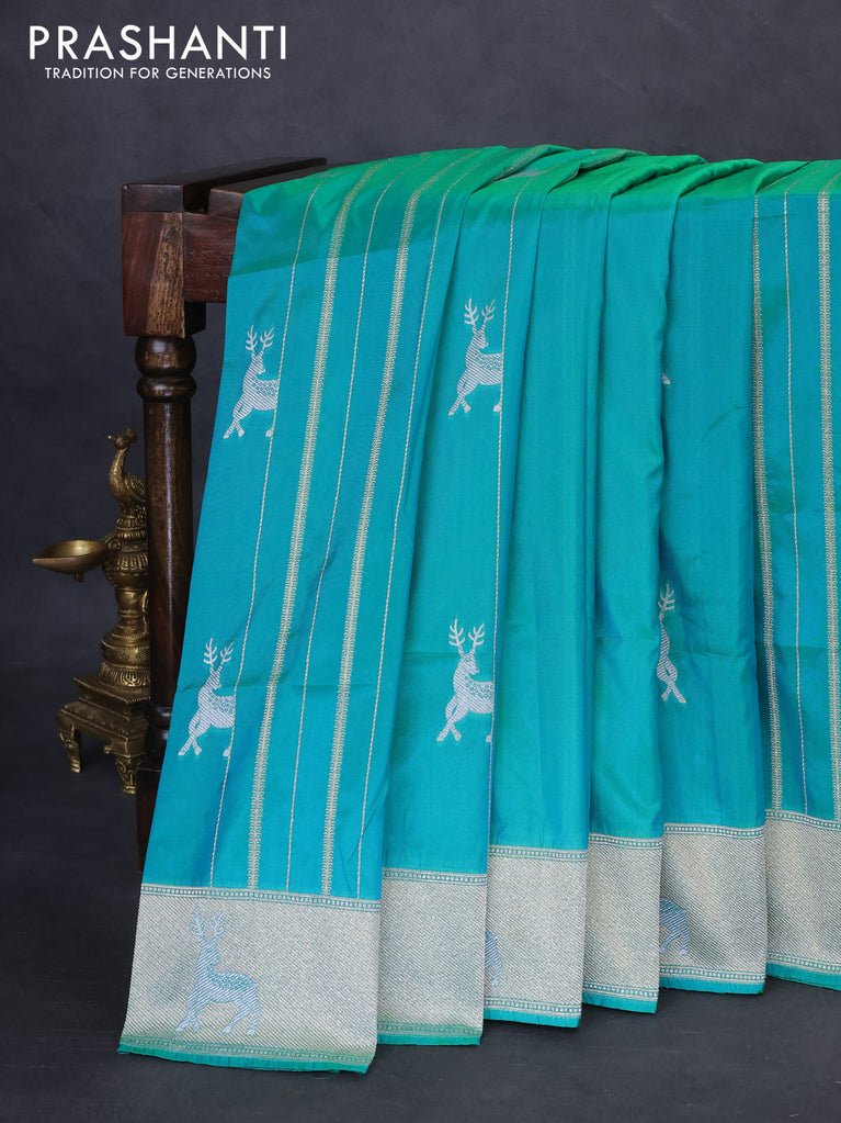 Banarasi semi katan silk saree teal green with allover silver & gold zari weaves and deer design zari woven border