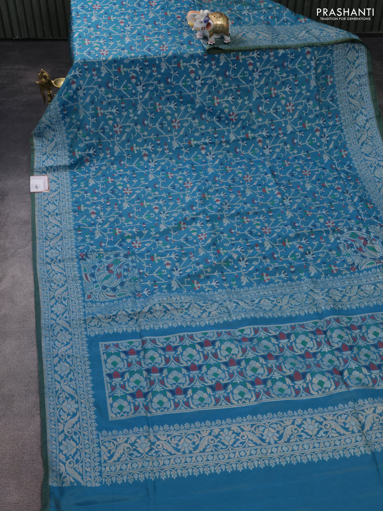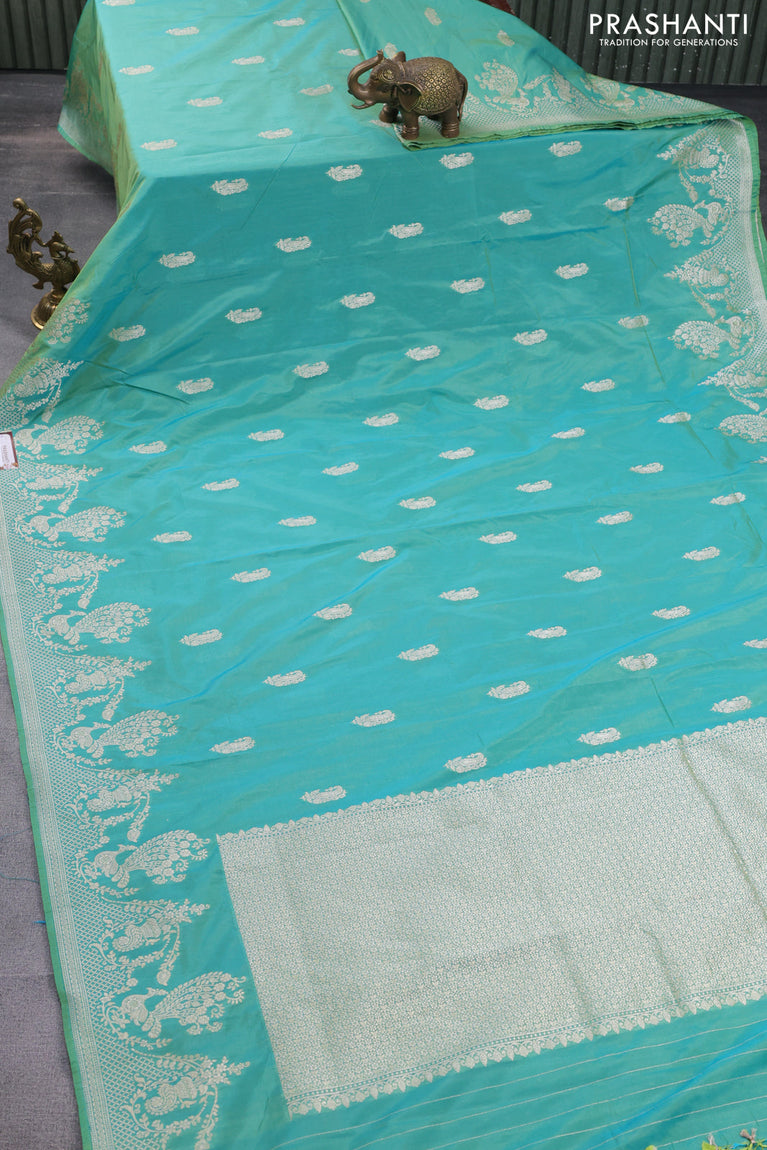 Banarasi semi katan silk saree teal bluish green with silver zari woven buttas and rich zari woven border