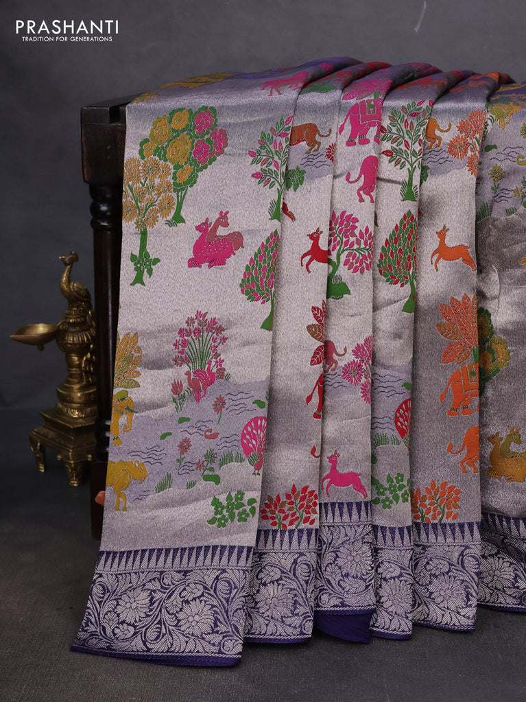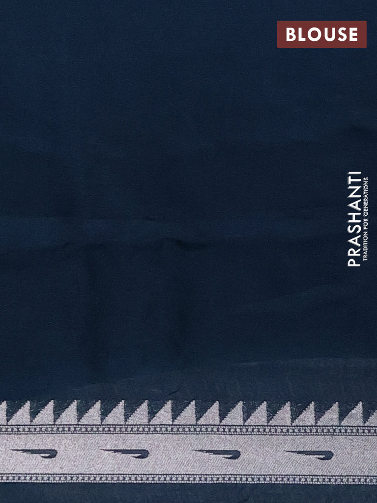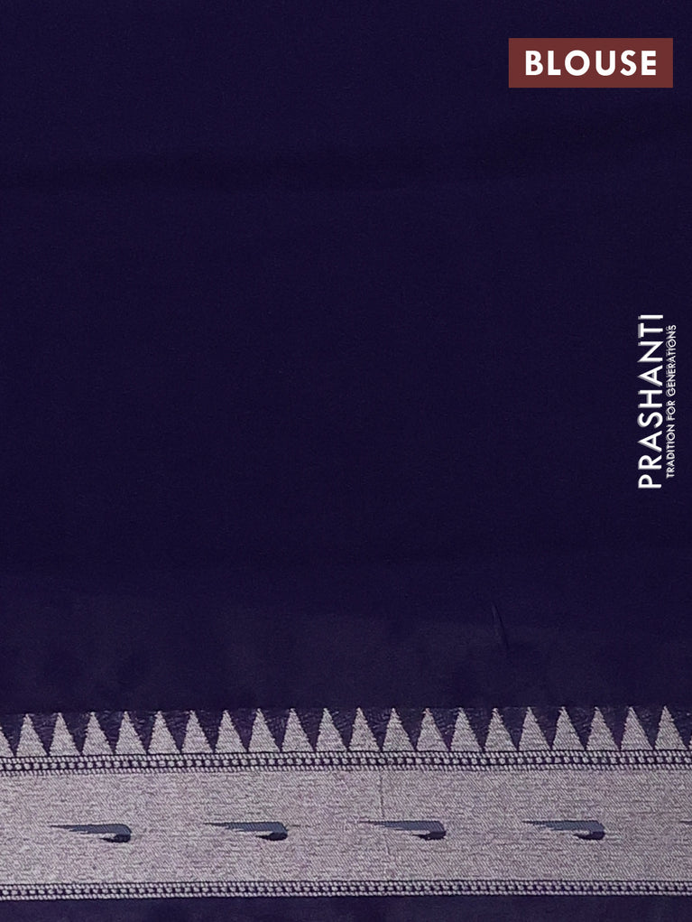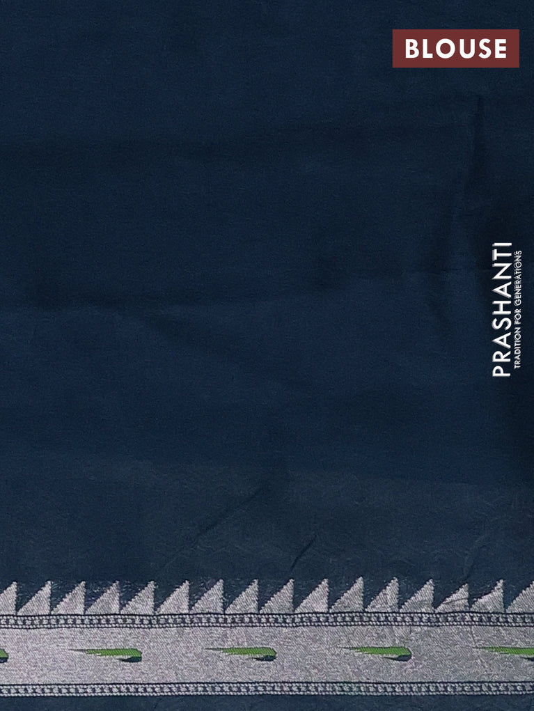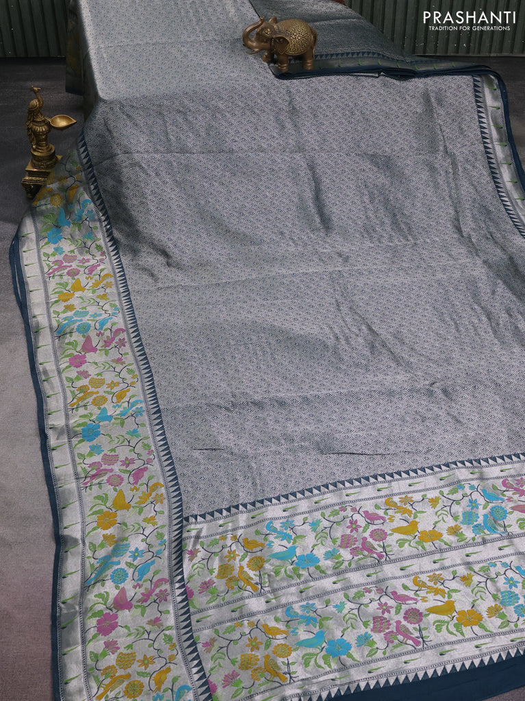 Banarasi semi raw silk saree navy blue with allover silver zari woven paithani weaves and woven border