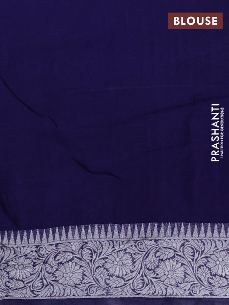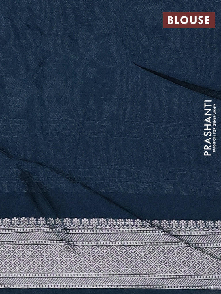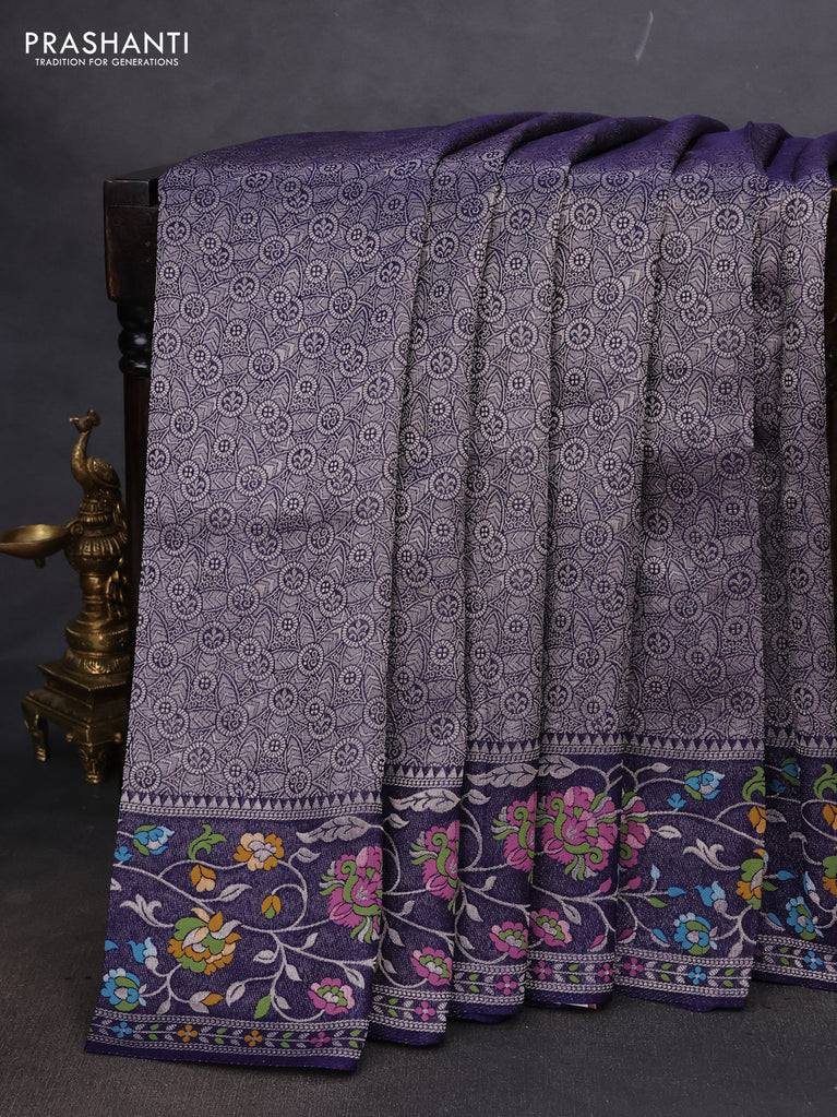 Banarasi semi raw silk saree navy blue with allover silver zari woven brocade weaves and floral design paithani border