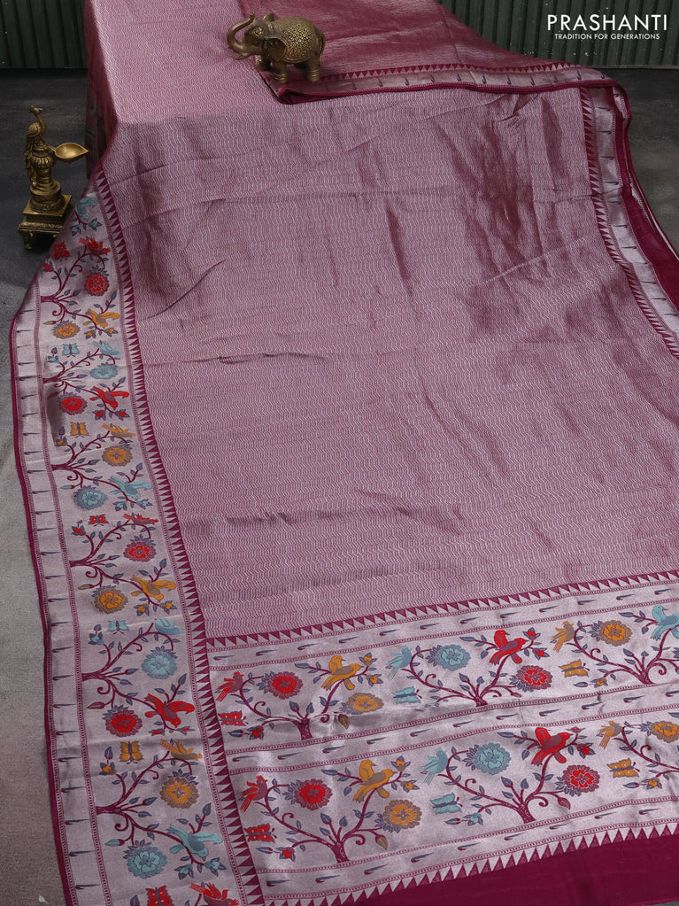 Banarasi semi raw silk saree pink with allover silver zari woven paithani weaves and woven border