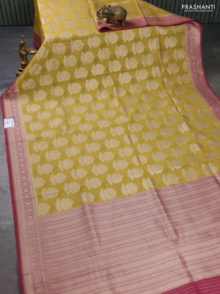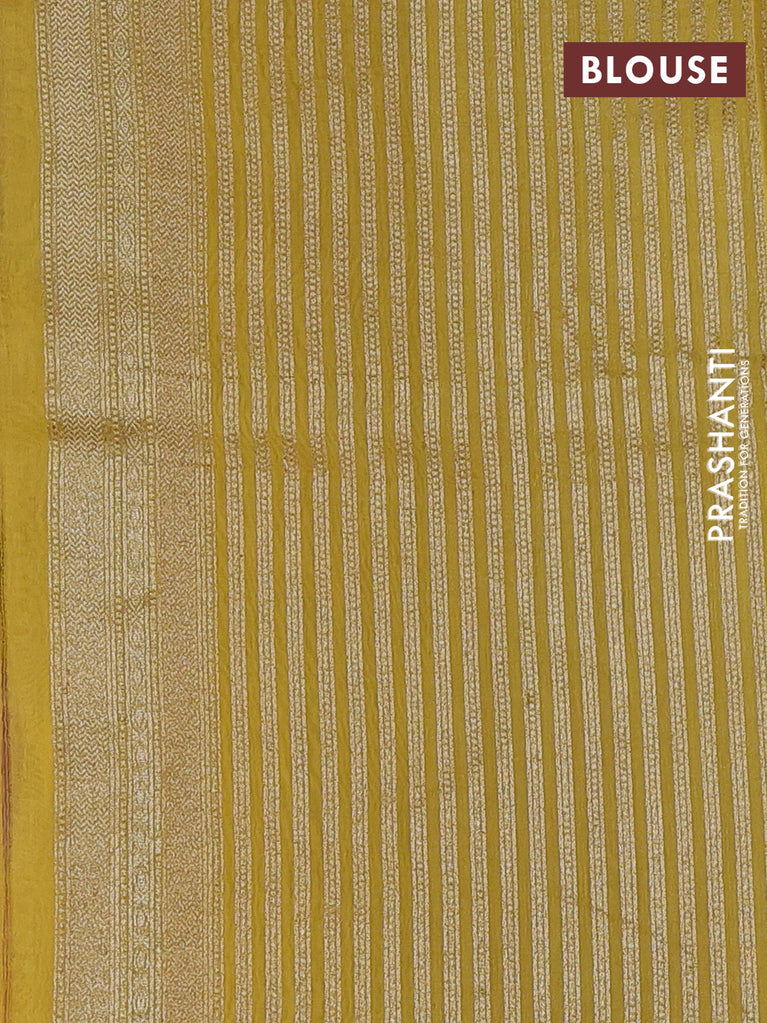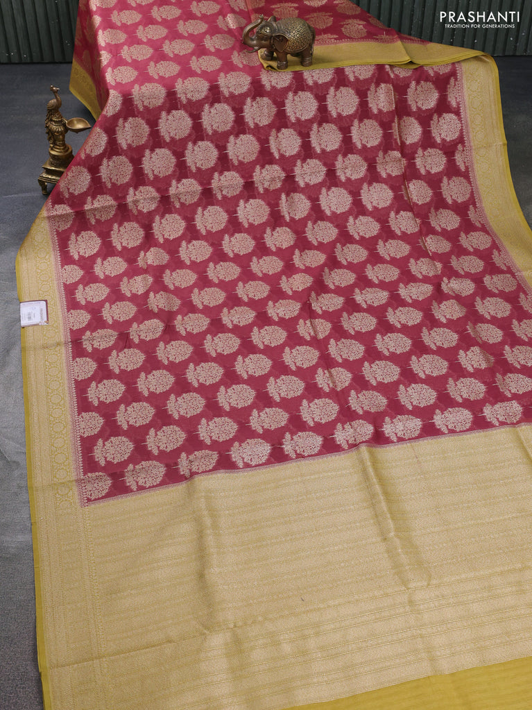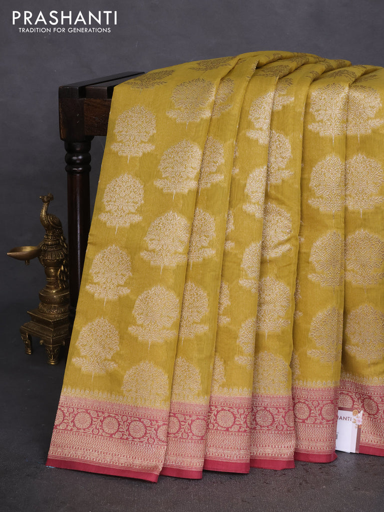 Banarasi silk cotton saree mustard yellow and pastel maroon with allover thread & zari woven butta weaves and woven border
