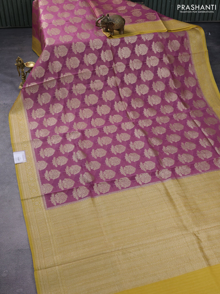 Banarasi silk cotton saree mauve pink and yellow with woven buttas and woven border