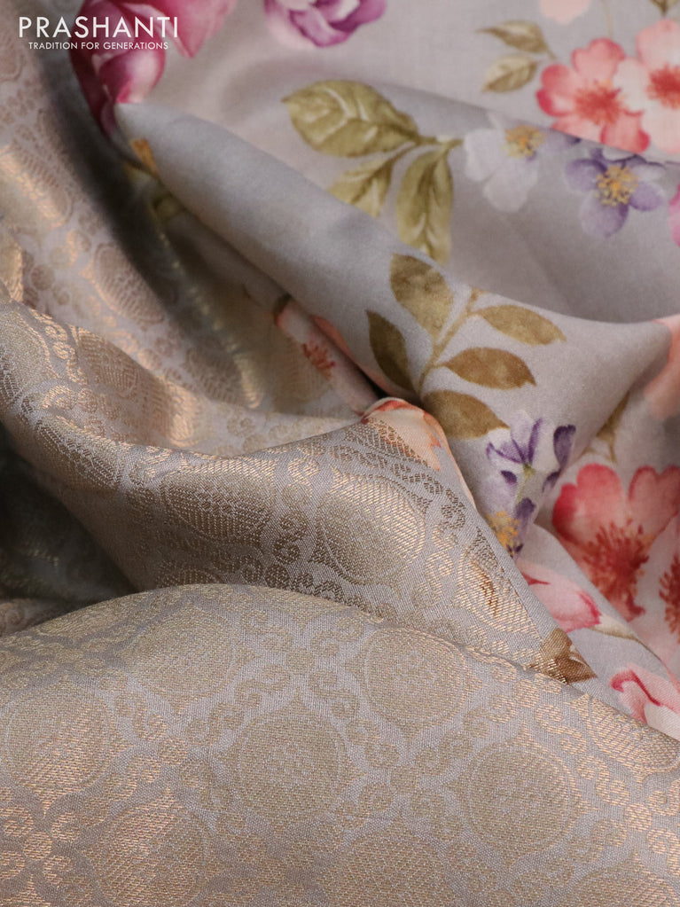 Banarasi silk saree pastel grey with allover zari woven brocade weaves and floral digital printed border