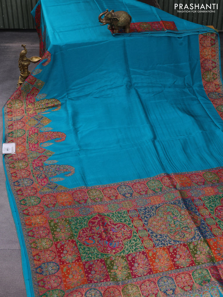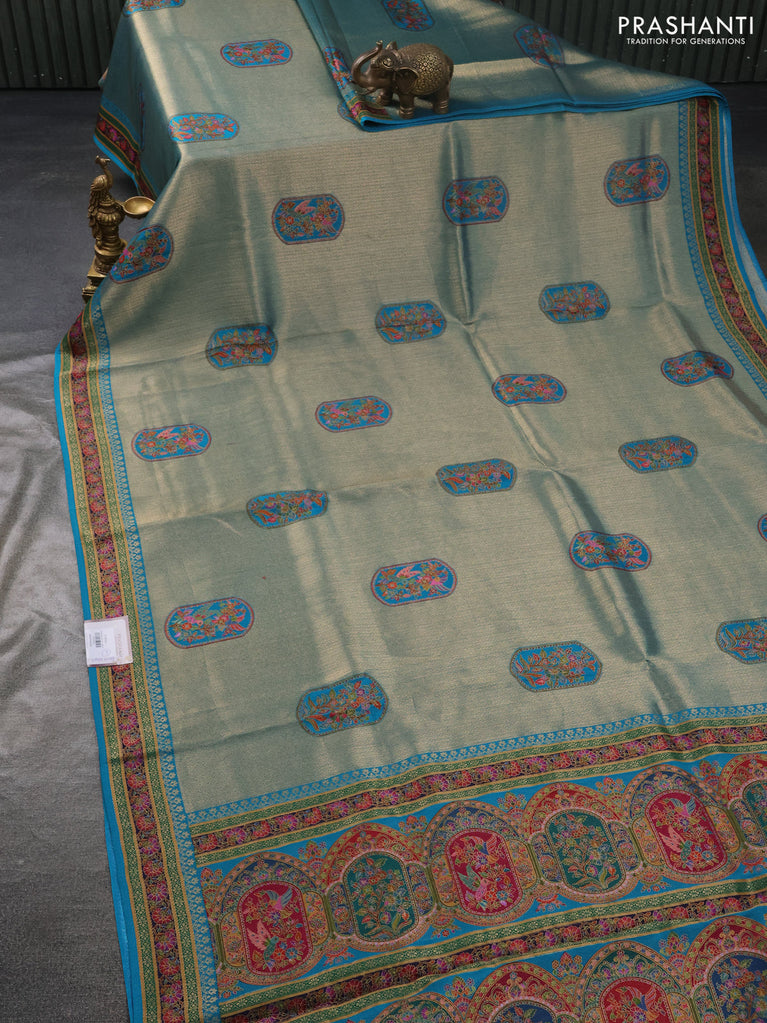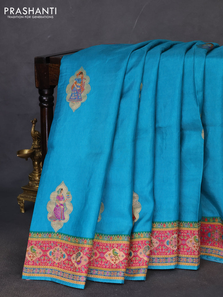 Banarasi silk saree teal blue shade with position prints and printed border