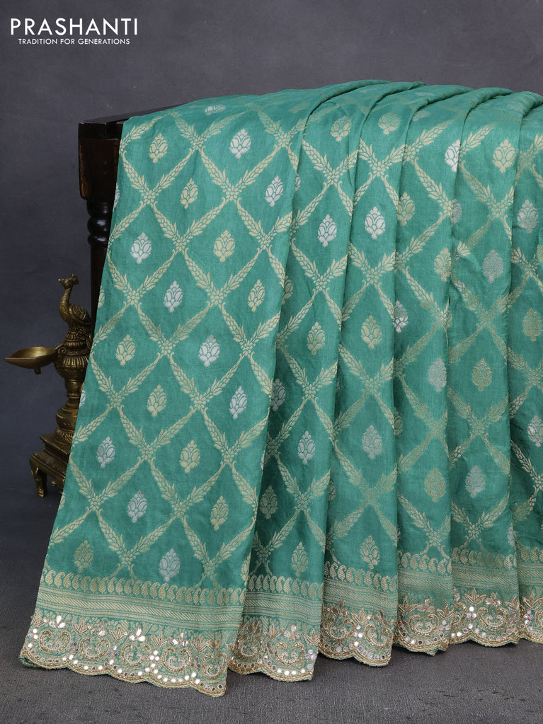 Banarasi silk saree teal green shade with allover banarasi zari weaves and gotapatti lace work border