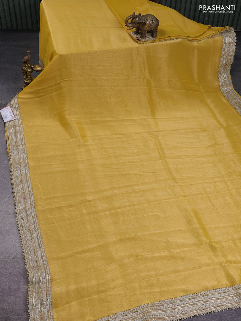 Banarasi tissue saree yellow with zari stripes pattern and lace work border