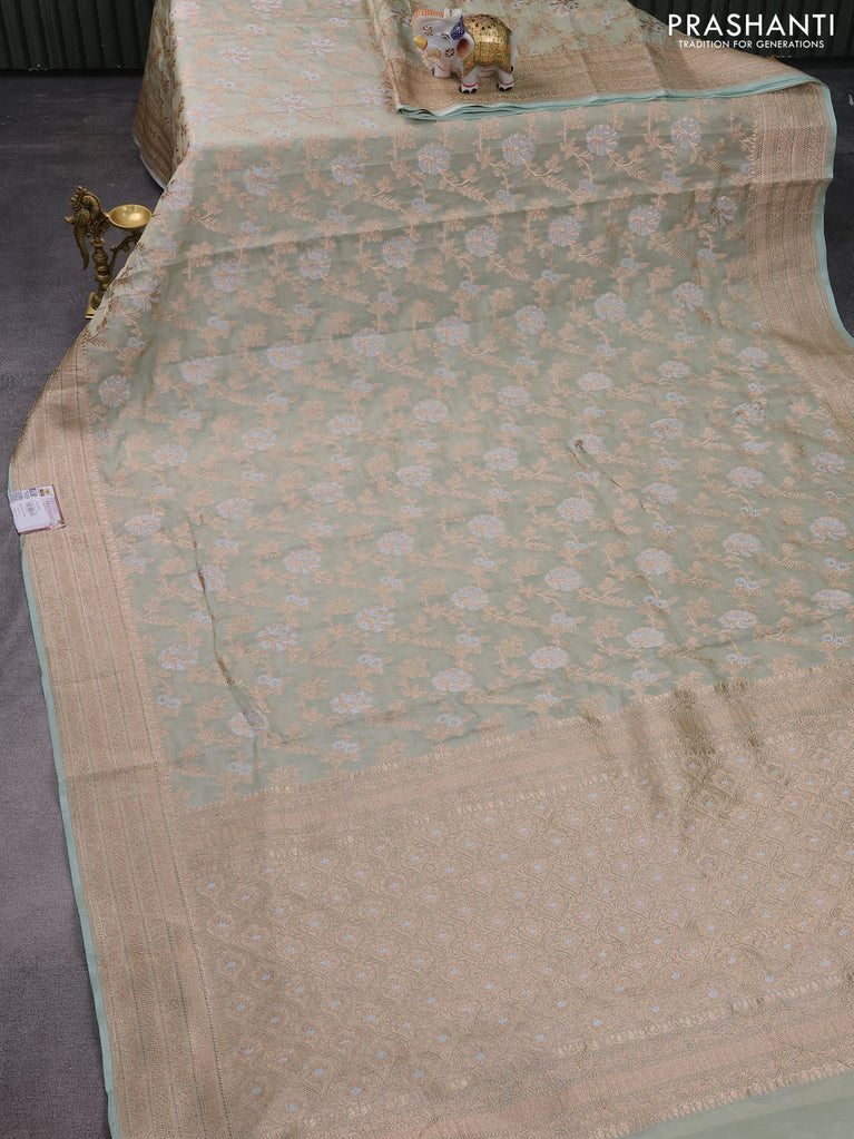 Banarasi tissue silk saree pastel green shade with allover thread & zari woven floral weaves and zari woven border