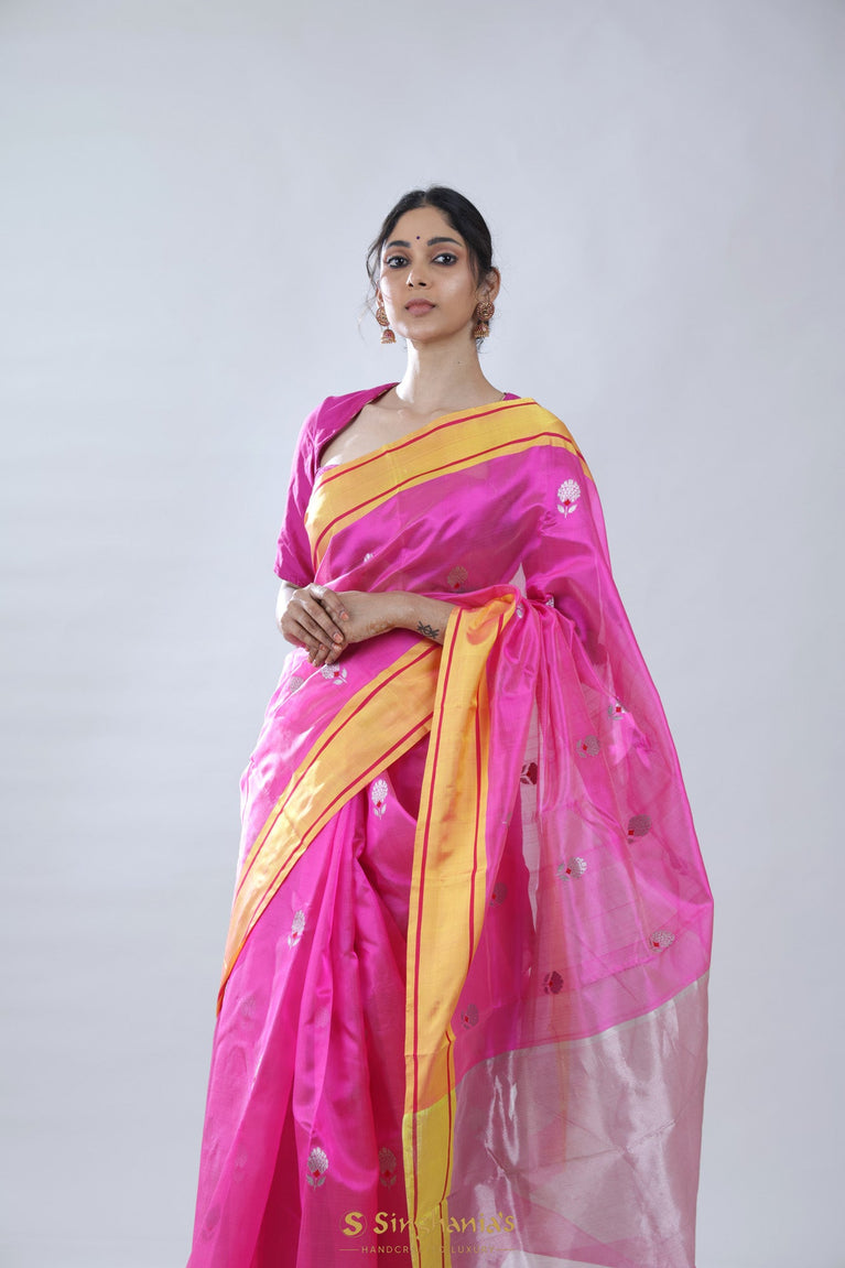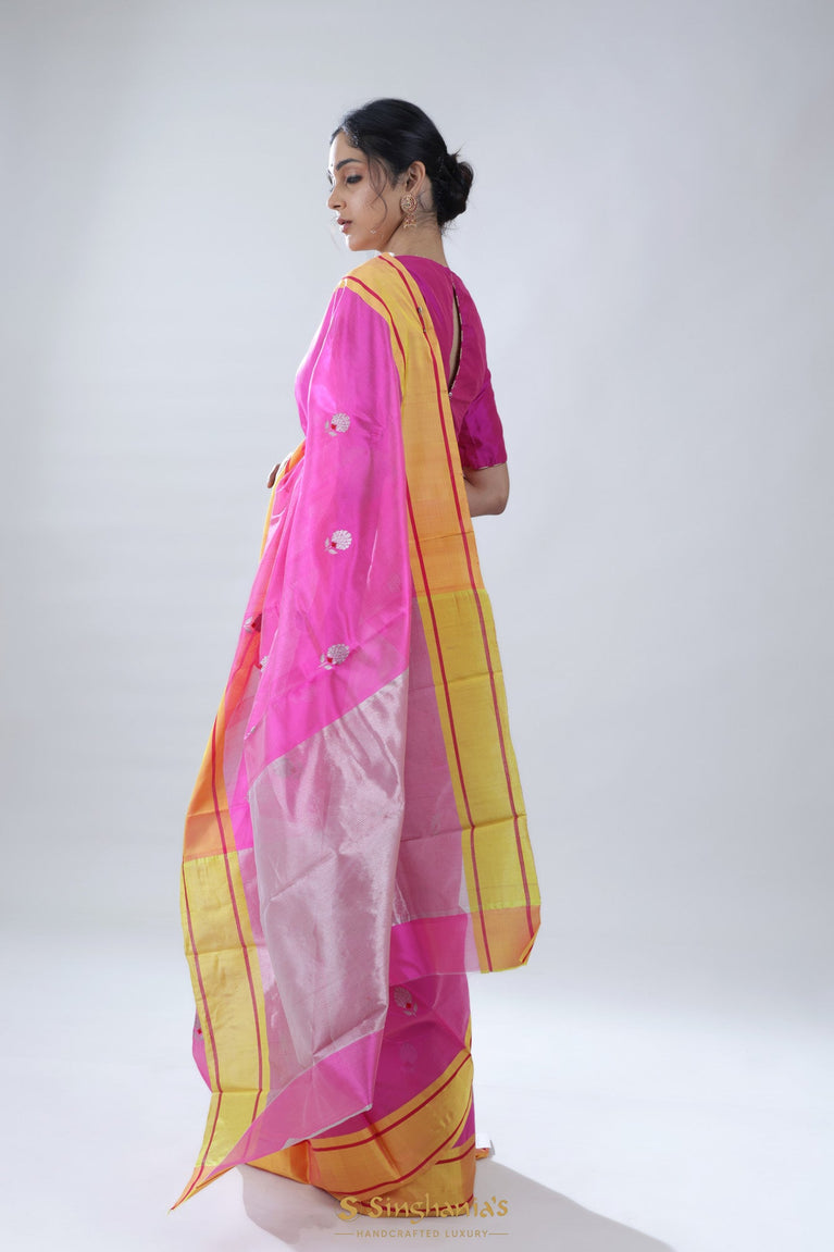 Elegant Chanderi saree with floral buttas in meenakari work, ideal for festive and wedding parties. This handwoven piece comes in a barbie pink colour, accentuated with small contrast border.