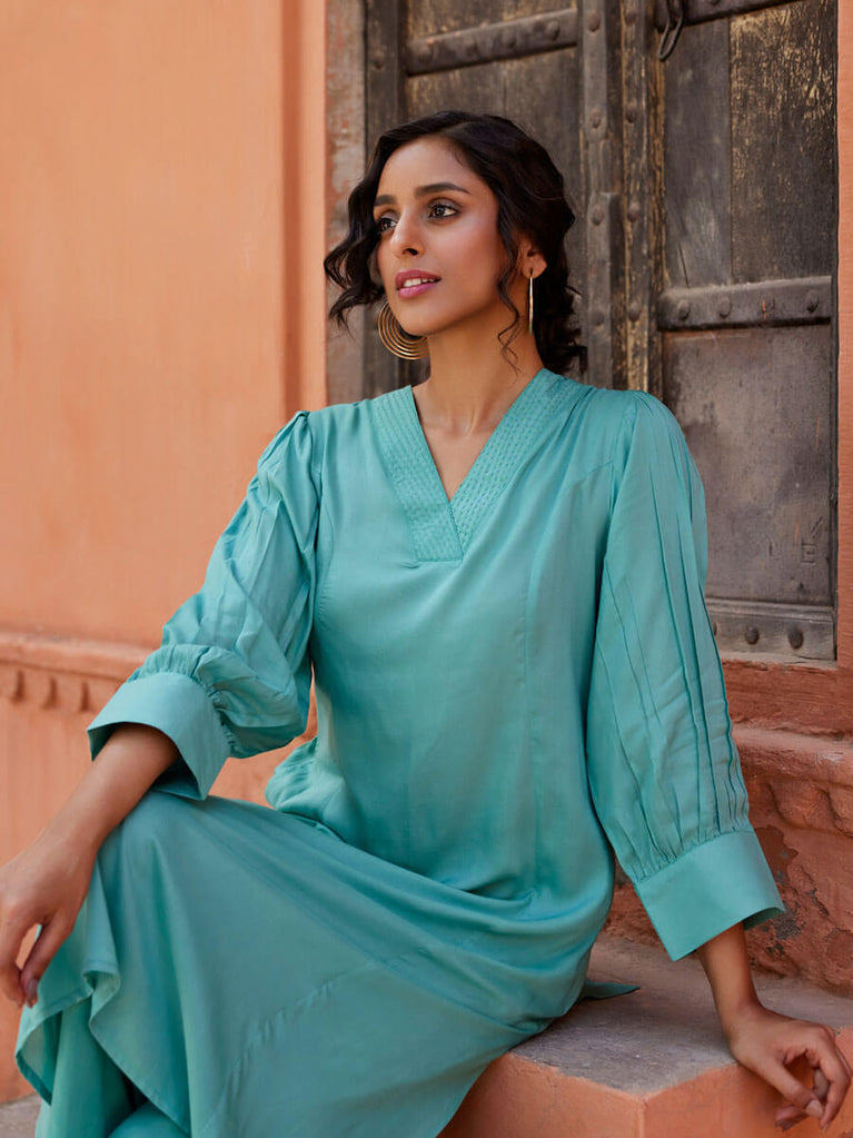 Banyan Leaf Cotton Slub Pleated Dress With Pockets