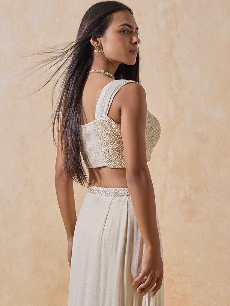 From draped sarees to flowing skirts, this cream blouse is designed to complement it all. Intricate sequin and bead embroidery lends it a refined sparkle, while pleated straps and a smocked back balance structure with stretch, ensuring comfort without compromising on elegance.