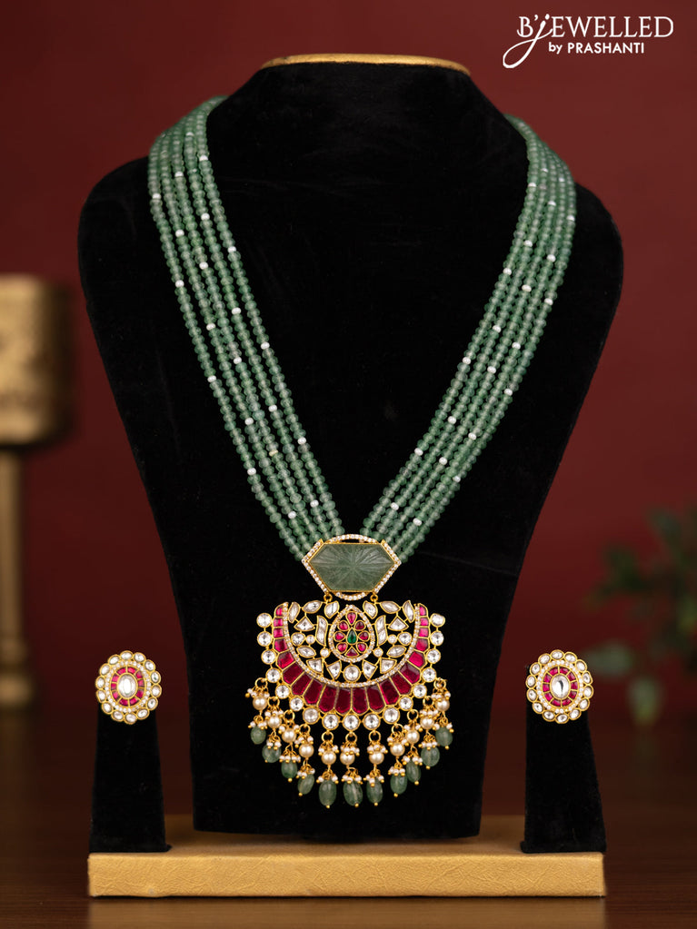 Beaded multilayer green haaram with jadau kundan stones and natural beads & pearl hangings