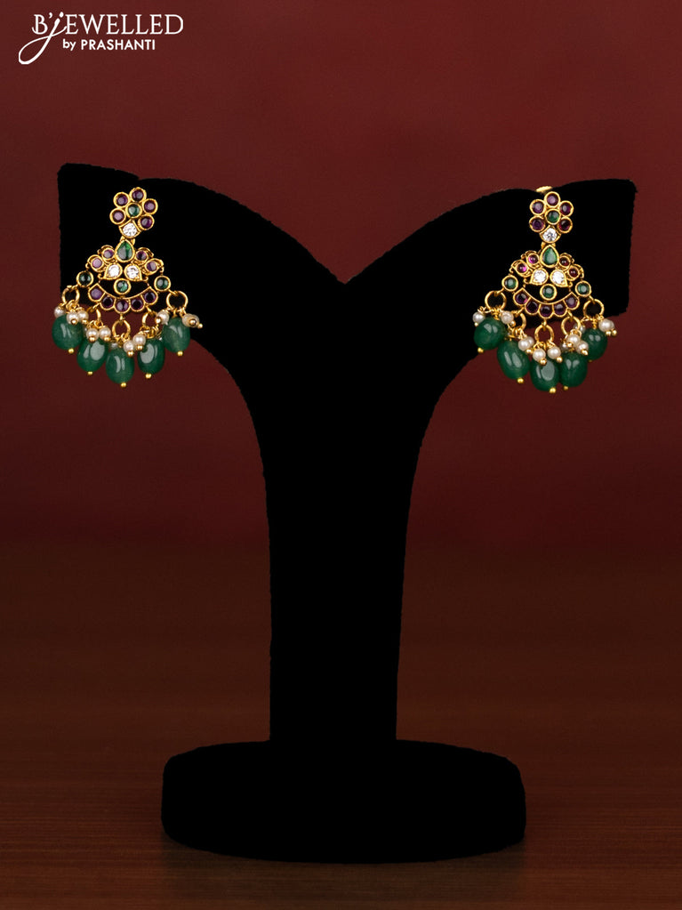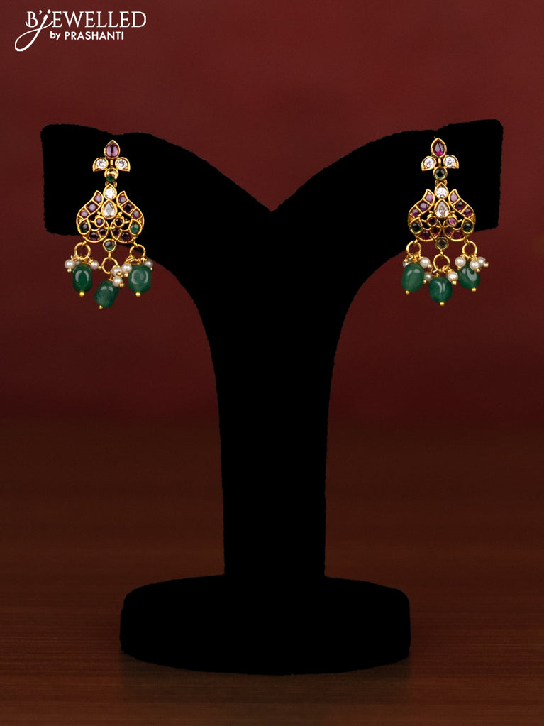 Beaded multilayer emerald necklace krishna pendant with ruby & cz stones and pearl hanging in victorian finish