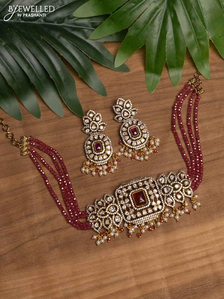 Beaded maroon choker with ruby & cz stones and beads hanging in victorian finish