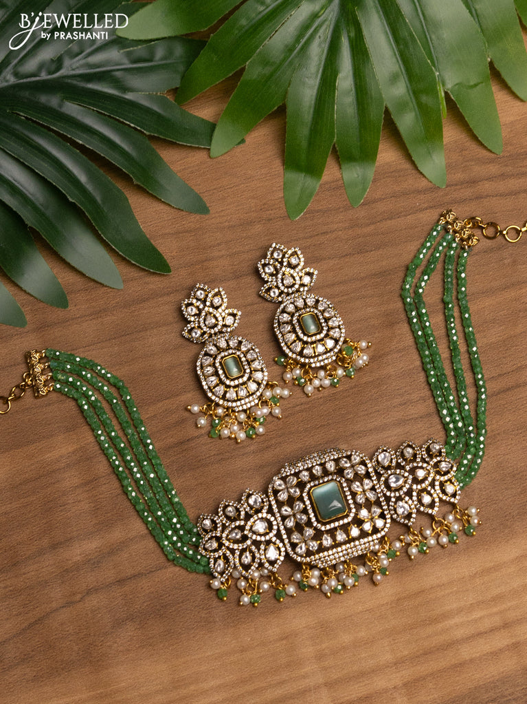 Beaded mint green choker with mint green & kundan stones and beads hanging in victorian finish