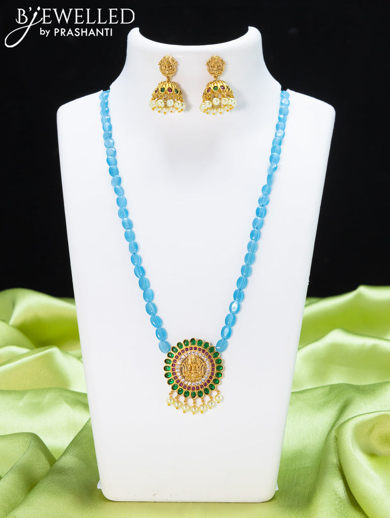 Beaded light blue necklace with kemp stone and lakshmi pendant
