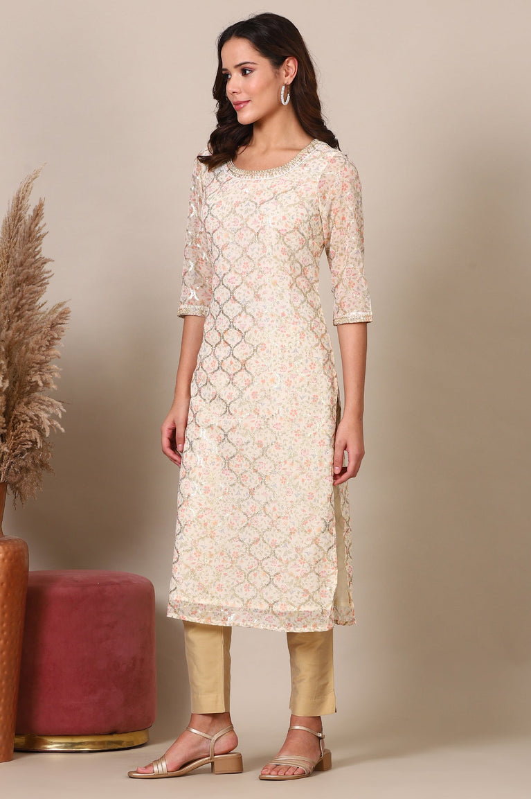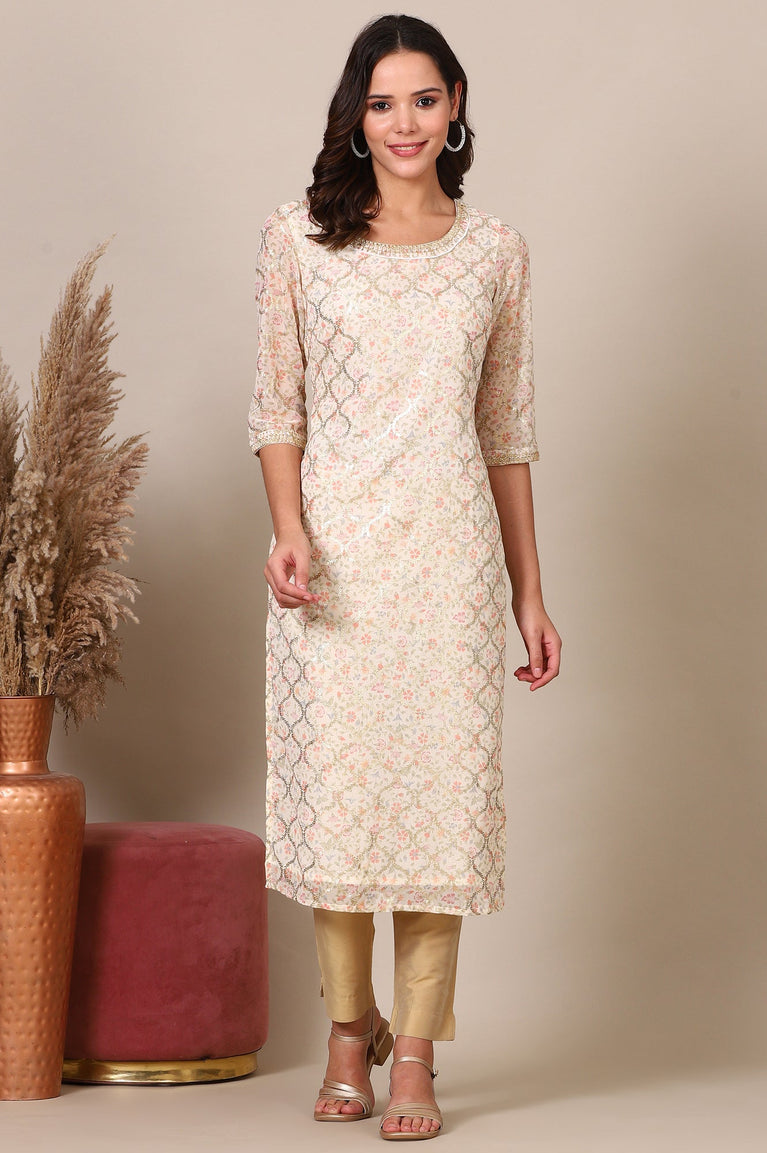 Beige Abstract Printed Georgette Kurta with Embellished Neck