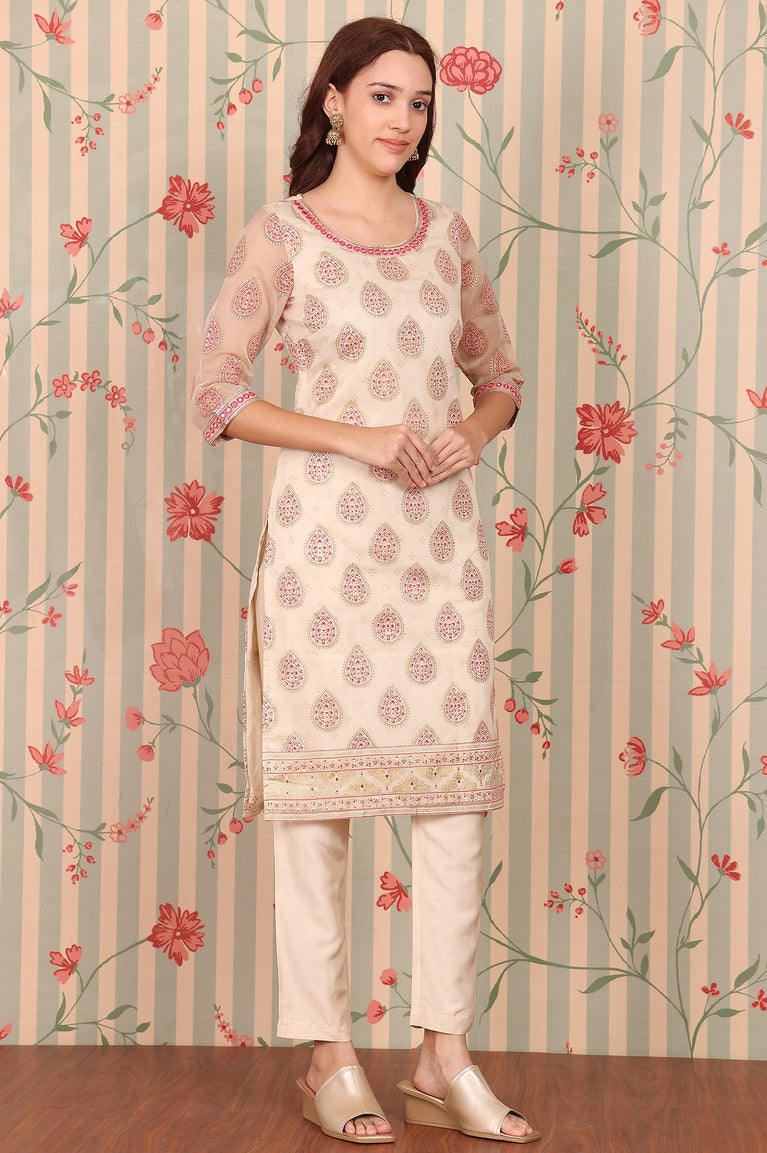 Beige Abstract Printed Beaded Cotton Straight Kurta, Palazzo and Dupatta Set