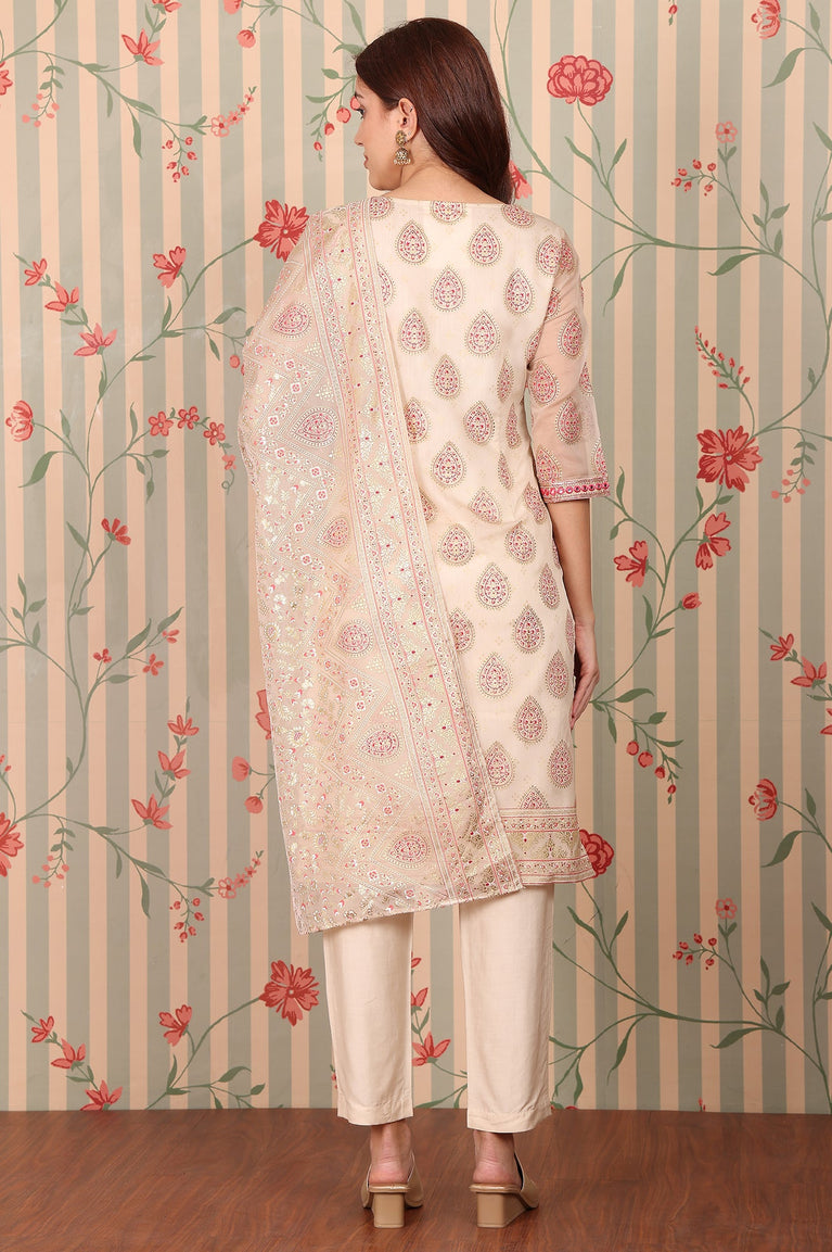 Beige A-line Jacquard Kurta, Palazzos and Dupatta Set