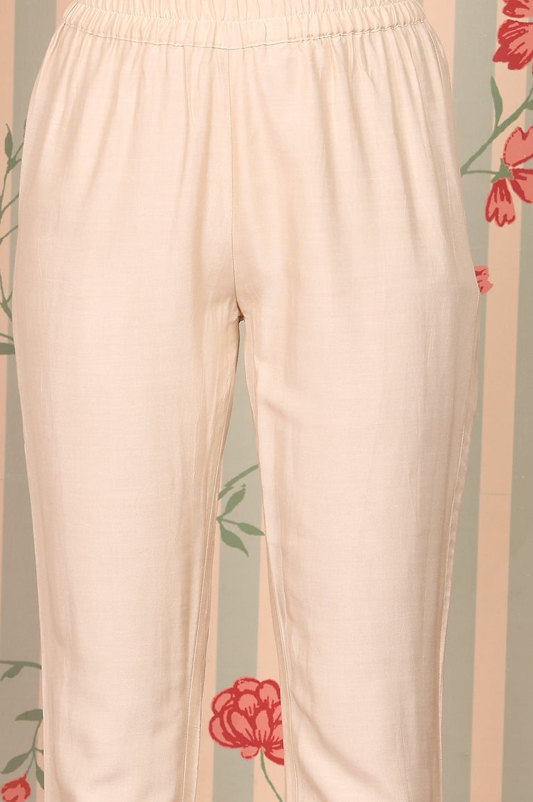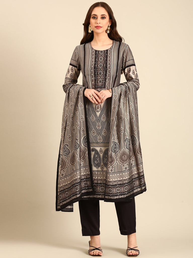 Beige Abstract Printed Embroidered Kurta, Trousers and Dupatta Set