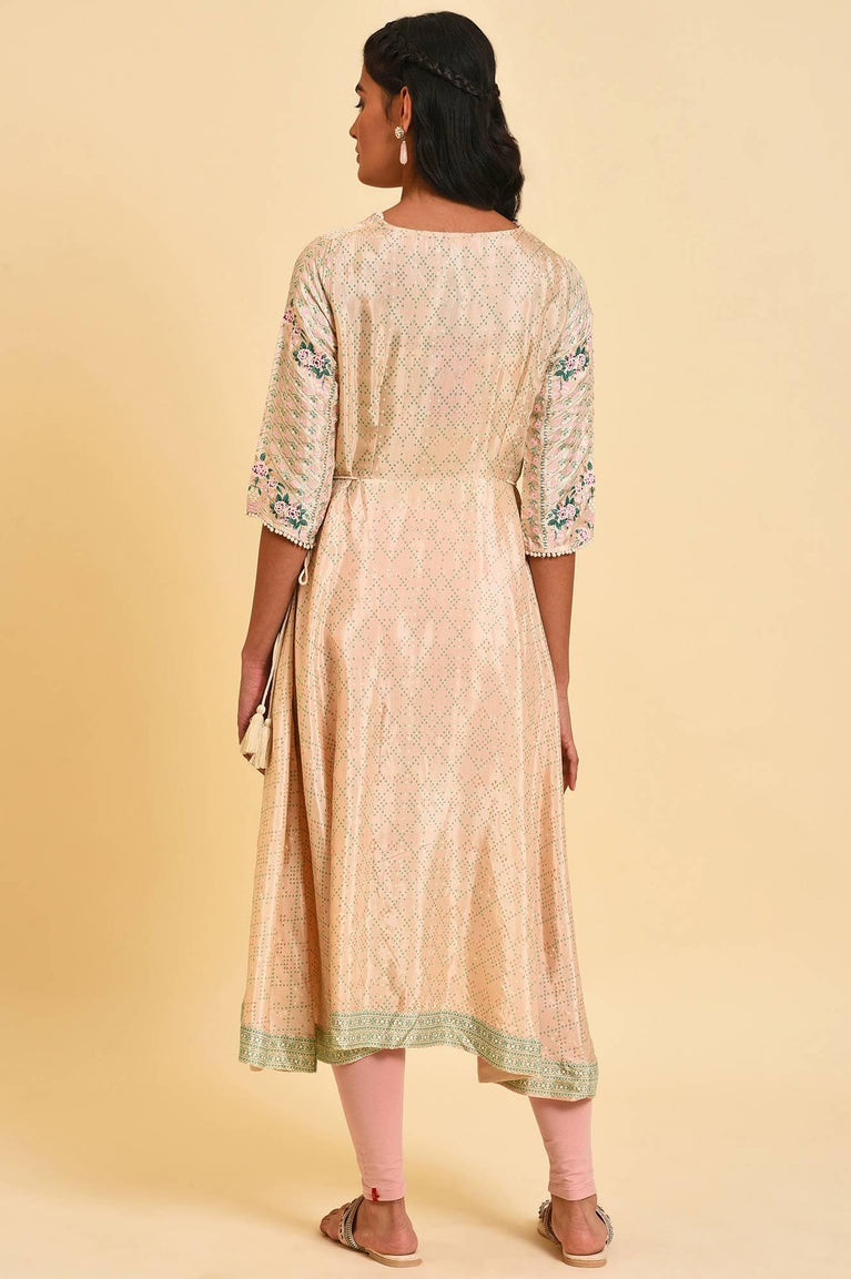 Beige Festive Asymmetric kurta In Print. The kurta Also Features Embellished Neckline And Embroidery. The Set Also Includes Blush Pink Solid Tights.