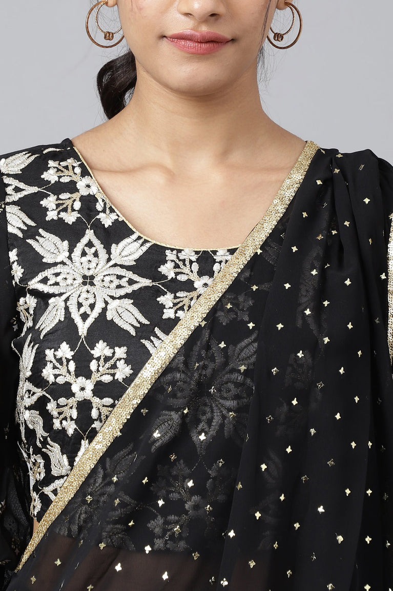 Make Heads Turn At Any Occasion In This Fashionable Black 3D Embroidered Crop Top And Semi Flare Palazzos. It Has A Pre Stitched Saree Drape Which Looks Very Gorgeous When Worn And Is Super Comfortable To Wear. It Is A Must Have This Season And Is Sure To Earn You Compliments.