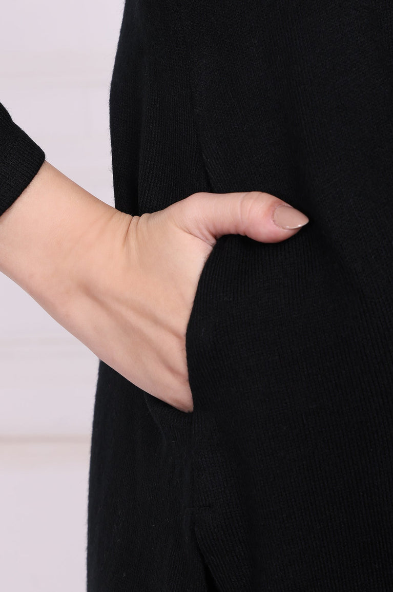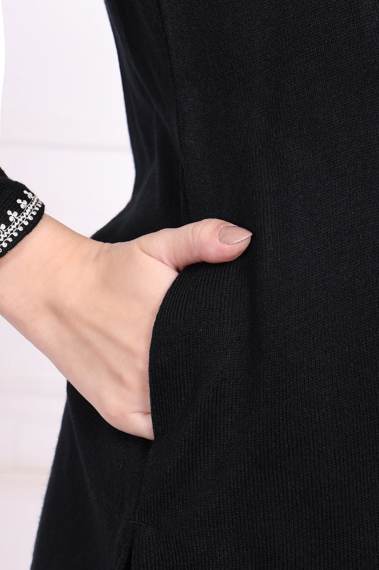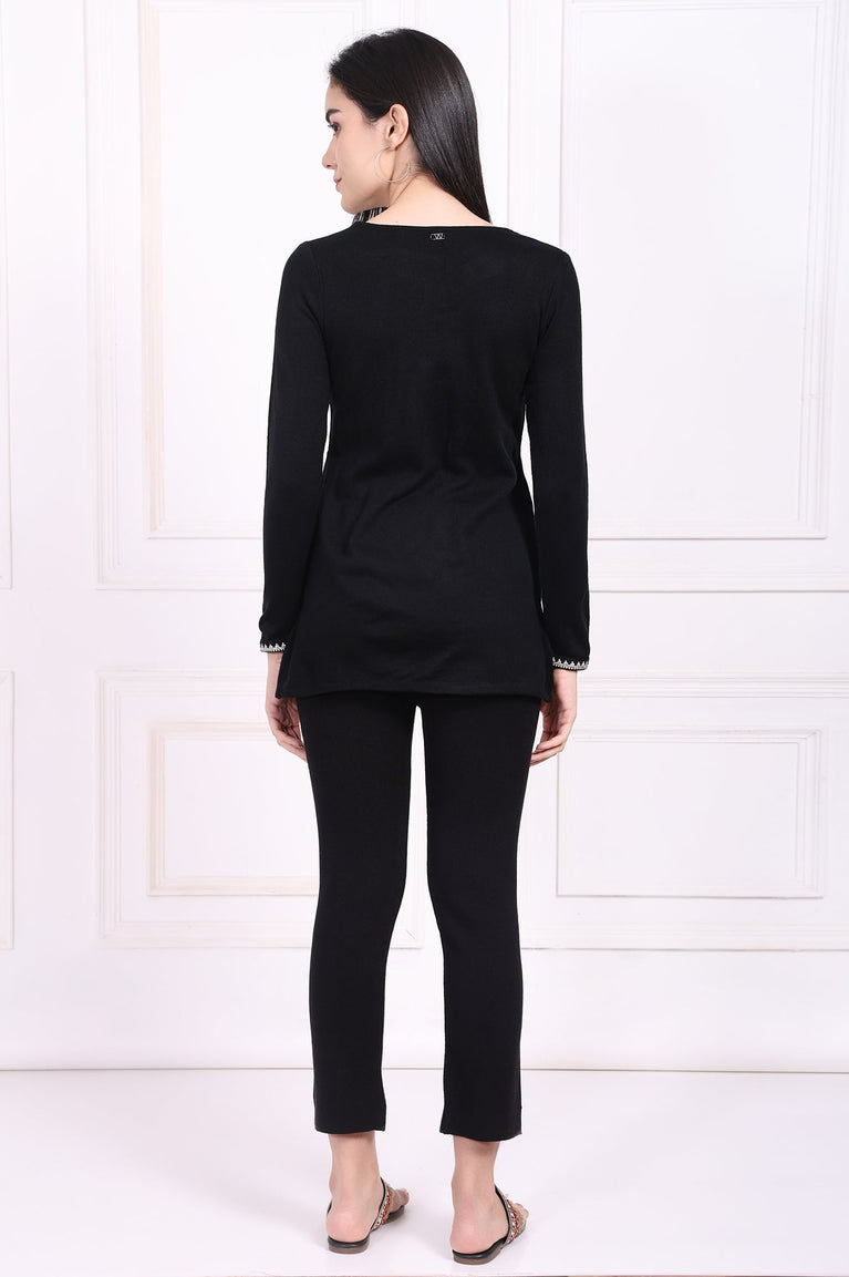 Refined and versatile, this black acrylic tunic for women is a wardrobe essential. Featuring intricate thread embroidery on the neckline and cuffs, this straight silhouette tunic with side slits offers a flattering fit. The soft acrylic fabric ensures comfort and warmth, making it perfect for casual outings or festive gatherings. Elevate your style with this elegant and versatile piece.