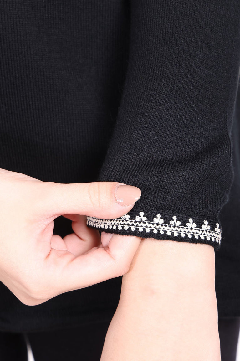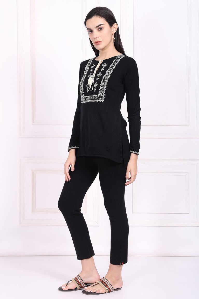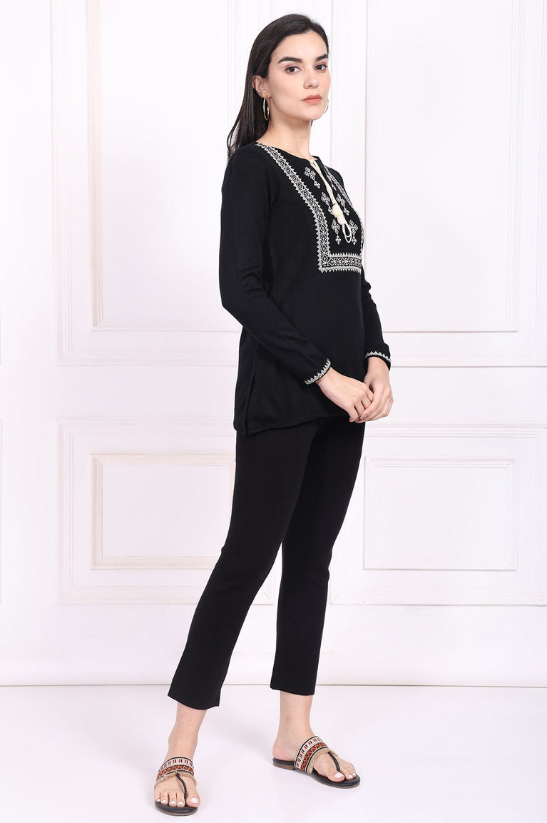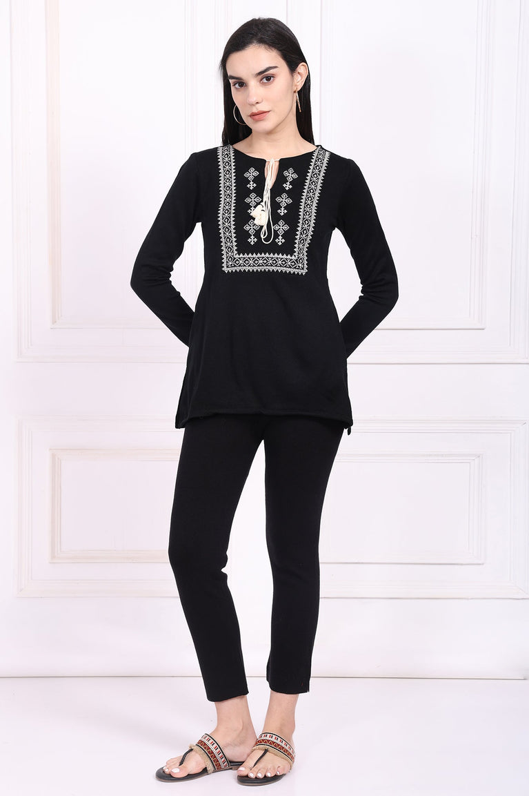 Timeless grace meets cozy comfort in this stunning black tunic, a true masterpiece of winter wear. Crafted from a wonderfully soft acrylic knit, it's the perfect companion for chilly days, offering enveloping warmth without sacrificing an ounce of style. The intricate white ethnic embroidery on the yoke frames the face beautifully, creating a striking contrast that captures the eye and speaks to artisanal heritage. This elegant tunic for women is designed around a charming keyhole neckline, which is further detailed with delicate, handcrafted tassels that add a playful and bohemian touch to the sophisticated design. You'll find the full-length sleeves are finished with matching embroidered borders at the cuffs, echoing the central design for a wonderfully harmonious and polished appearance. Its silhouette is a classic straight cut that flatters any figure, flowing gracefully to a straight hemline, while side slits ensure complete ease of movement. As a perfectly practical touch, it includes discreet side seam pockets. Entirely opaque for confident wear, this winter tunic masterfully combines traditional artistry with contemporary design, making it an effortlessly chic choice for casual outings or relaxed festive gatherings. It’s the kind of versatile apparel you’ll reach for again and again.