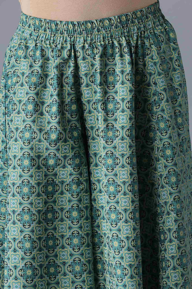 A kurta set laced with elegance to make you look graceful on all occasions. It features a jet black glittered geometric print straight kurta having zari embroidered yoke with round neckline and three-quarter sleeves. Well-matched with green calf length printed flared culottes.