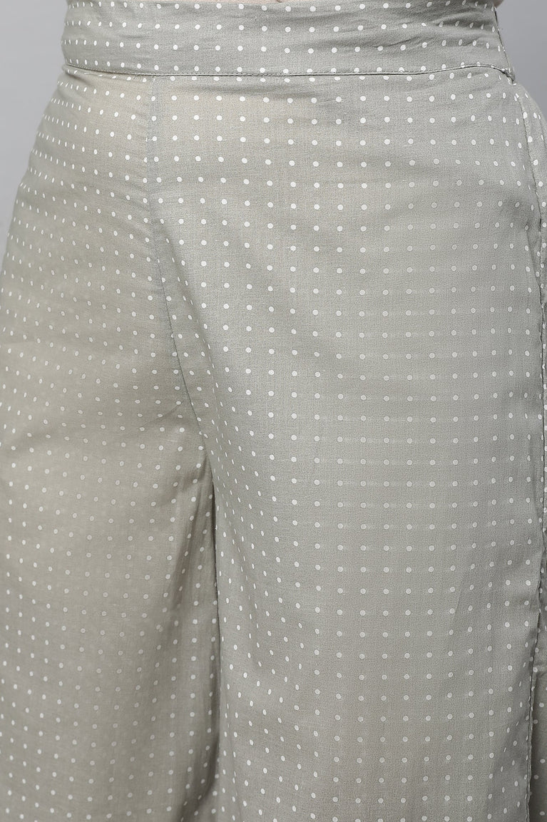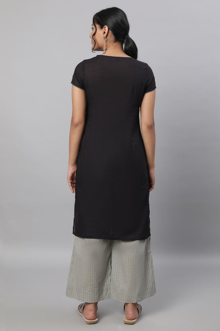 Black embroidered kurta in straight silhouette has short sleeves and round neck. It is paired with grey polka dot palazzos pants.