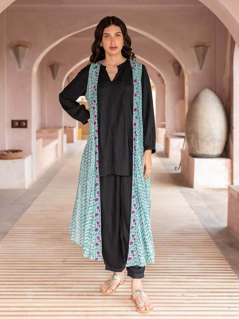 A black and rust combination A-Line kurta with box pleat detail at the waist in the beautiful floral print demands to be taken out for any function. The embroidery at the yoke blends and makes it the statement set you need this season.