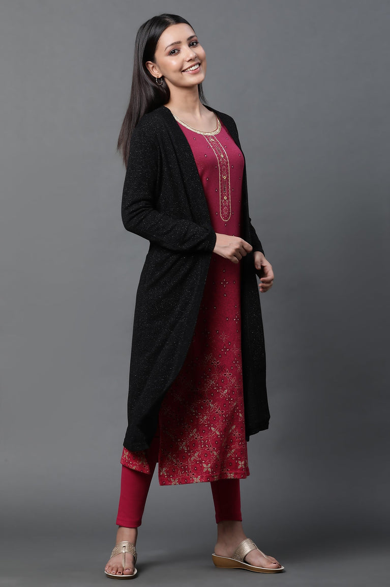 Made With Premium Soft Touch Acrylic, This Knit Cardigan Has Open Front And Features Floral Print On Border For Contrasting Details. It Has Printed Full Sleeves And Long Length, Which Gives A Chic Look.