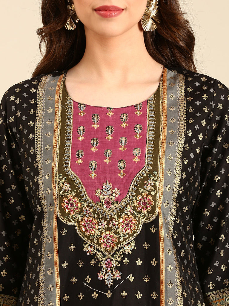 Black Geometric Printed Embellished A-Line Satin Kurta