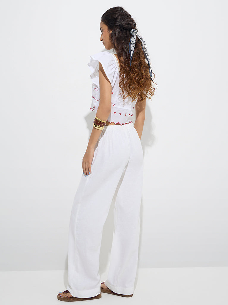These white palazzos from Bombay Paisley flaunt intricate embroidery along the hemline for added style. Woven from a luxurious cotton-linen blend, they offer a lightweight feel ideal for warmer days. Designed with an elasticated waistband and functional side pockets, they balance comfort with everyday practicality.