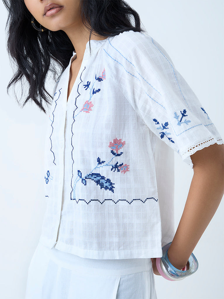Breeze through brunches and city strolls in this white cotton top by Bombay Paisley. Featuring a V-neck, adjustable straps, and a button placket, it’s designed for effortless styling. Exquisite floral embroidery on a seersucker-textured base adds artisanal charm, while crochet trims lend subtle detailing.