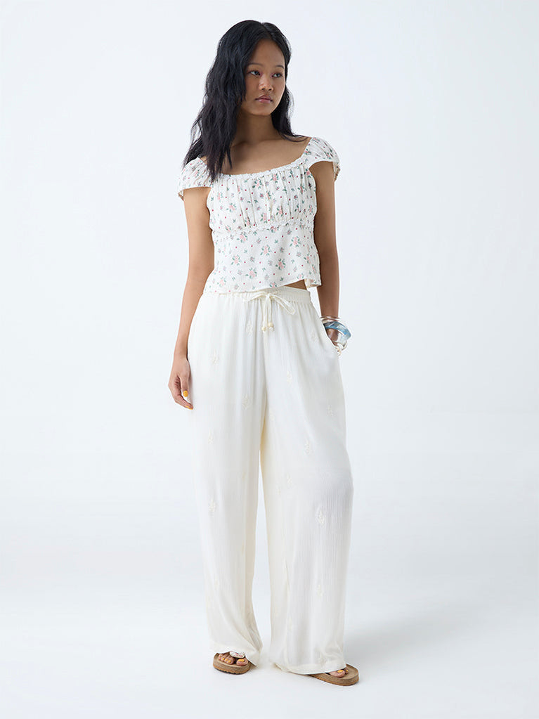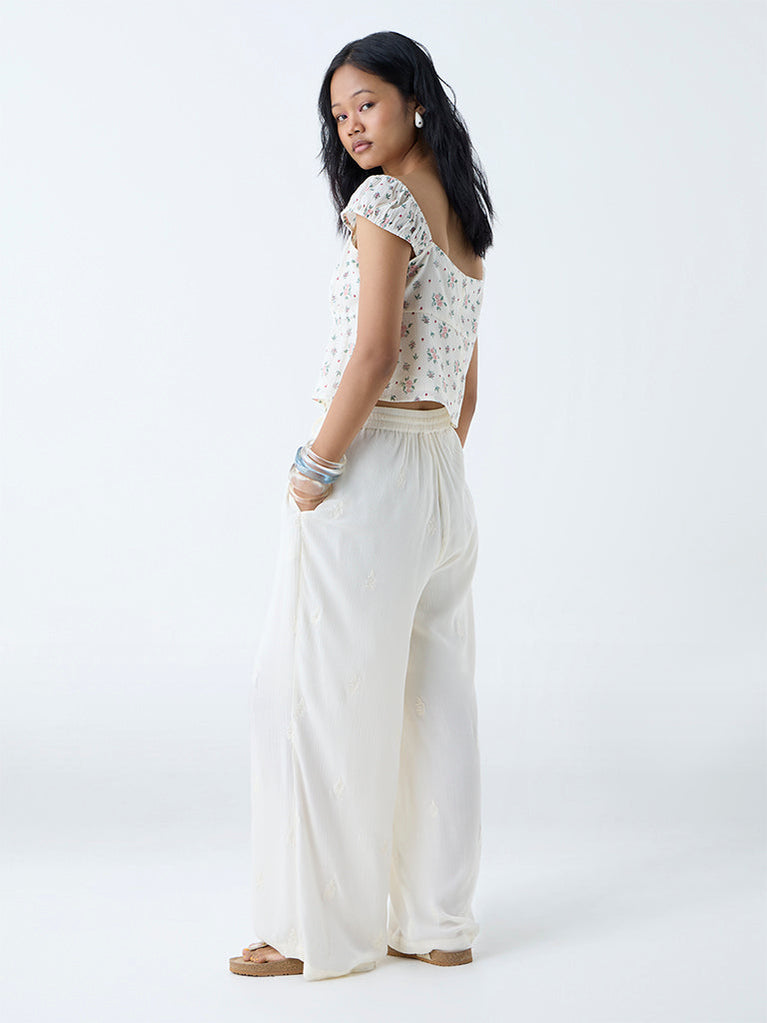 Ease into laid-back elegance with these white palazzos from Bombay Paisley. Cut from pure cotton, this pair flaunts exquisite embroidery that lends artisanal flair to its relaxed silhouette. The elasticated waistband ensures a flattering fit, while functional side pockets make them a versatile choice for both casual outings and festive affairs.