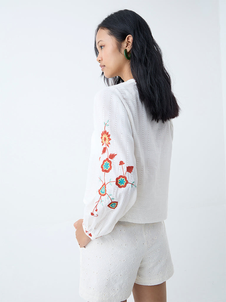 Breathe new life into your everyday wardrobe with this white top from Bombay Paisley. Woven from pure cotton for all-day comfort, it’s brought to life with nature-inspired embroidery that pops with colour and charm. The split neck is framed with a delicate tie-up detail, while voluminous blouson sleeves add a chic finish.
