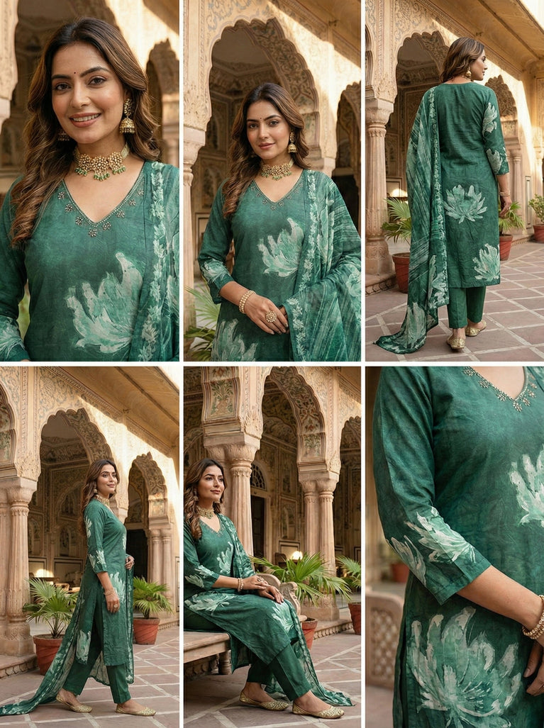 Experience elegance with this Bottle Green Suit Set crafted from soft muslin fabric featuring a delicate computer-printed design. The flattering V-neck is enhanced with intricate gotta patti lace, adding a touch of traditional charm. Paired with a lightweight organza dupatta, this ensemble promises comfort and style for any occasion. Elevate your wardrobe with this blend of classic craftsmanship and contemporary appeal.