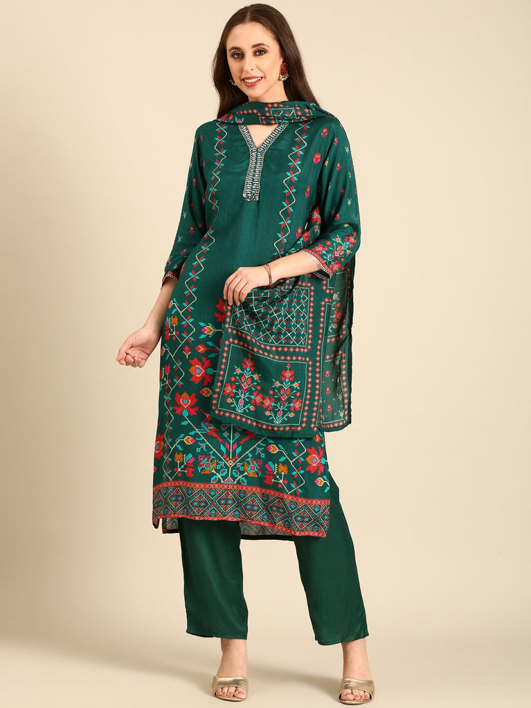 Elevate your wardrobe with this bottle green silk Anarkali three-piece suit set, exquisitely embroidered to perfection. The rich silk fabric offers a graceful drape, while intricate embroidery enhances its timeless charm. Ideal for special occasions, this ensemble combines traditional elegance with luxurious comfort, ensuring you make a refined statement wherever you go.